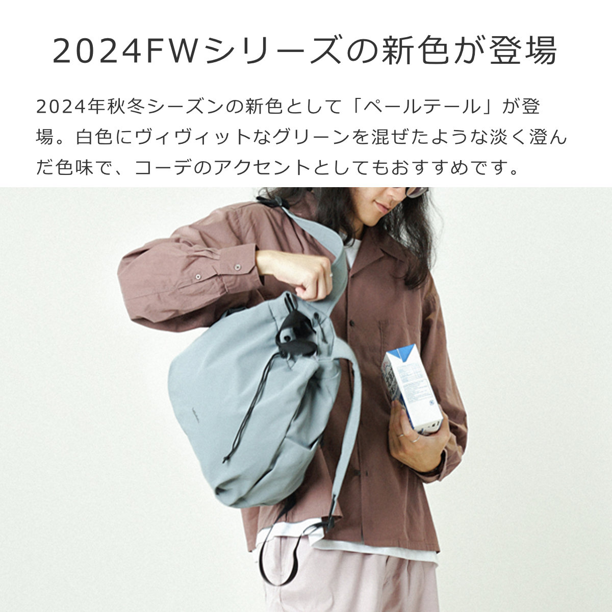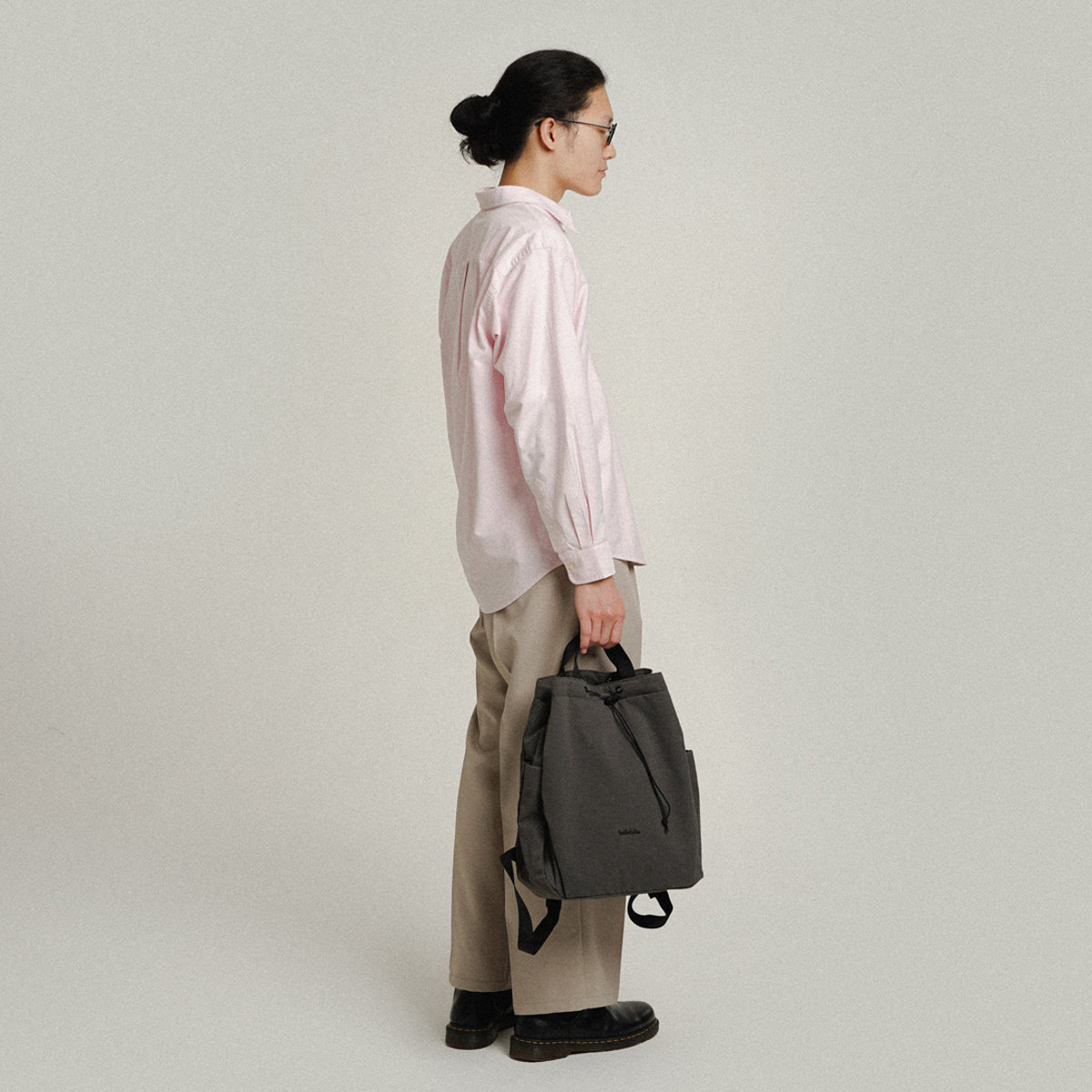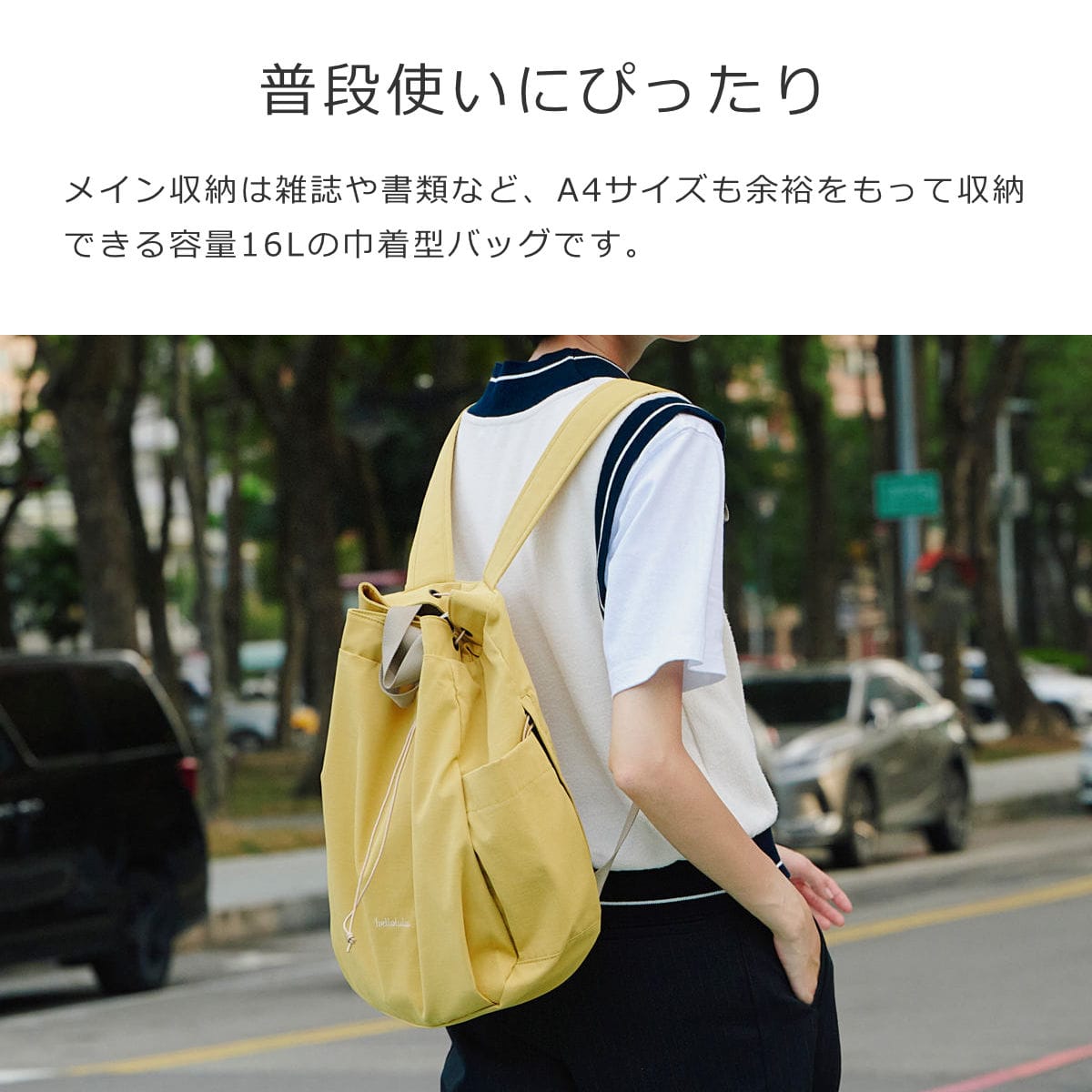 メイン収納は雑誌や書類など、A4サイズも余裕をもって収納できる容量10Lの巾着型バッグです。リュックなので自転車・バイクでも使いやすく、ちょっとした旅行にもオススメです。