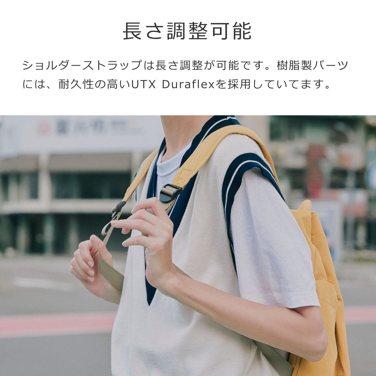 ショルダーストラップは長さ調整が可能です。樹脂製のパーツには、機能的で耐久性の高いUTX Duraflexを採用しています。