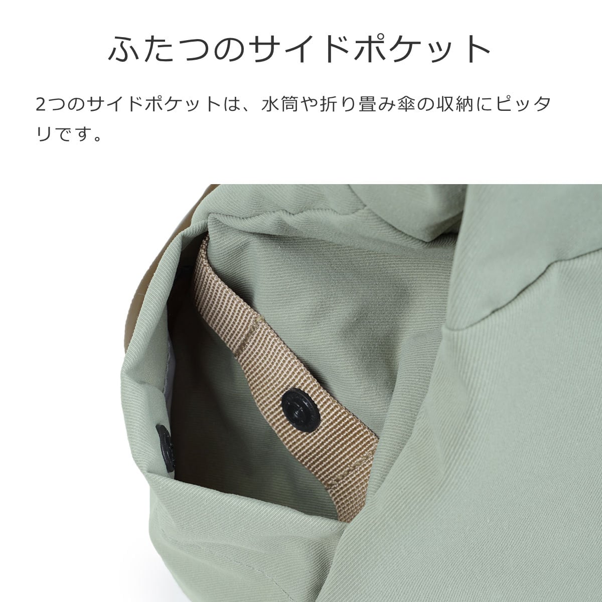 両サイドには、水筒や折り畳み傘の収納ができるポケットが付いています。