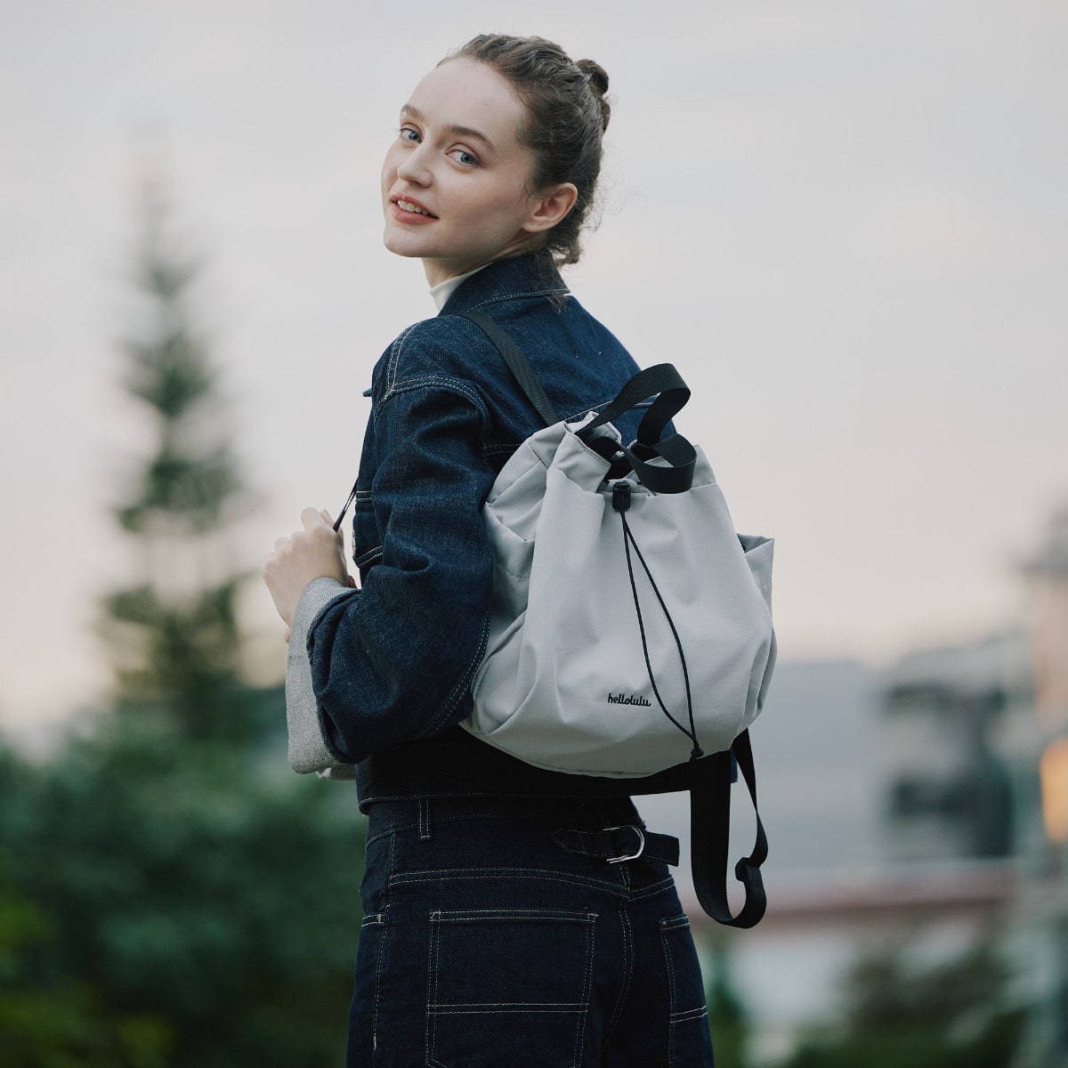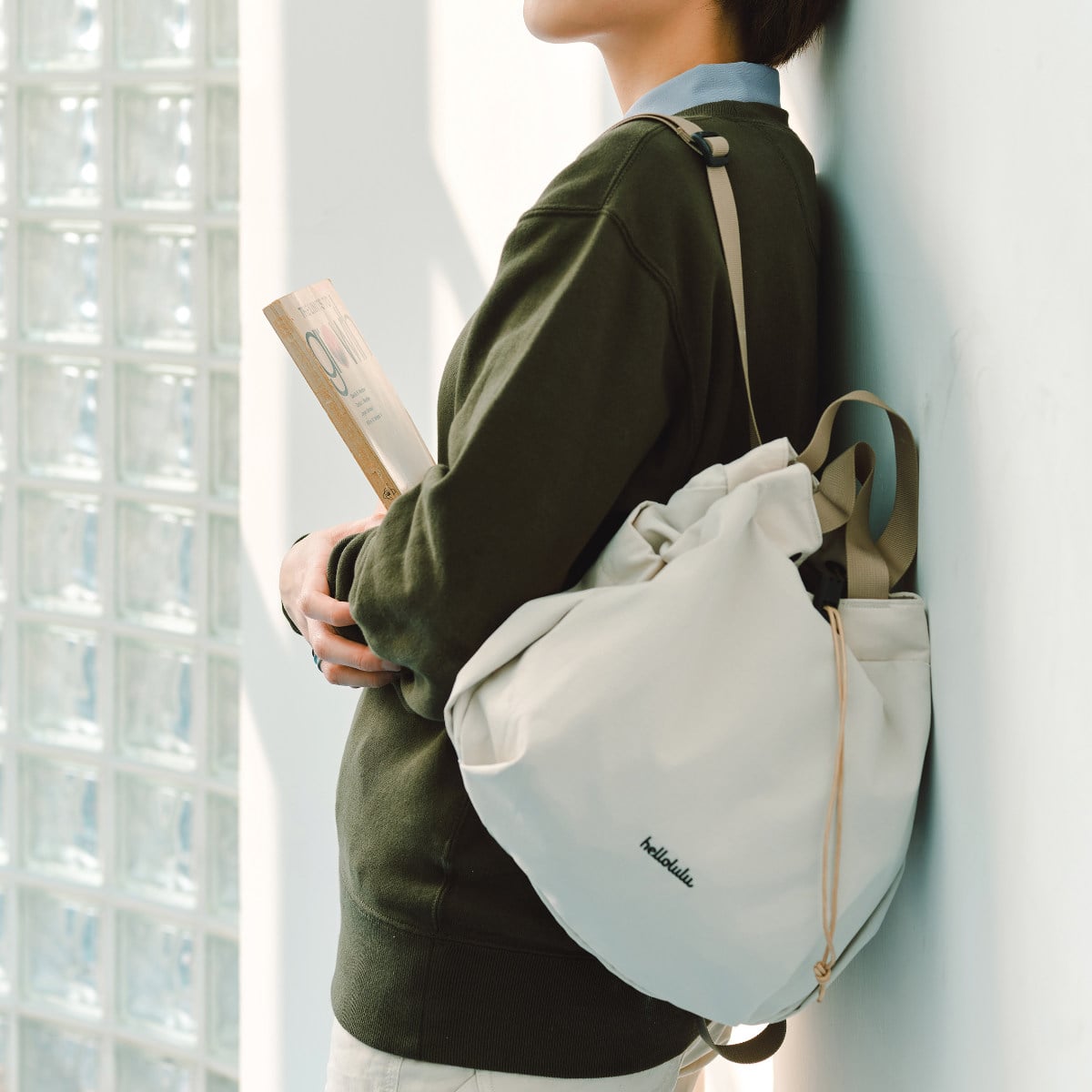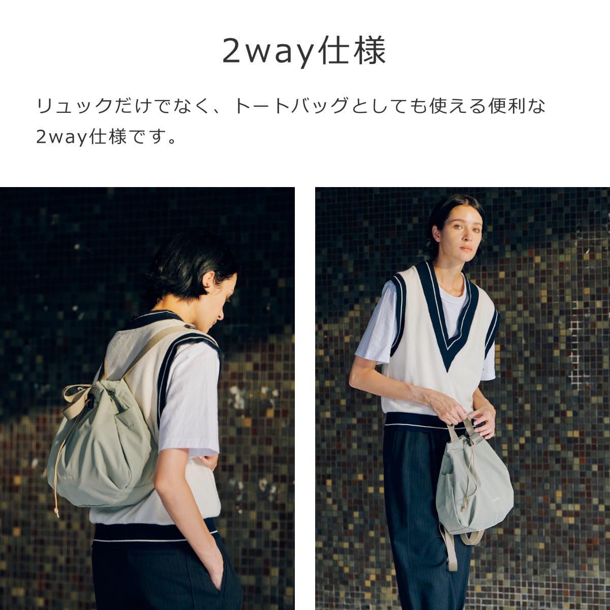 メイン収納が巾着式で開閉がしやすい、容量約6Lのバッグです。リュックなので自転車やバイクに乗る際も使いやすく、ちょっとした旅行にも便利なサイズ感です。