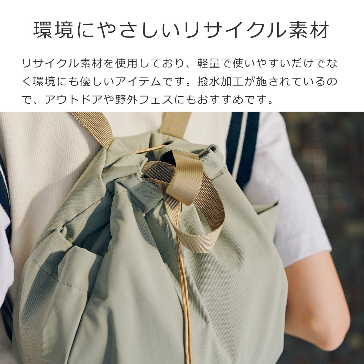 リサイクルしたポリエステル素材を使用しており、軽量で使いやすいだけでなく環境にも優しいアイテムです。撥水加工が施されているので、アウトドアや野外フェスにもおすすめです。