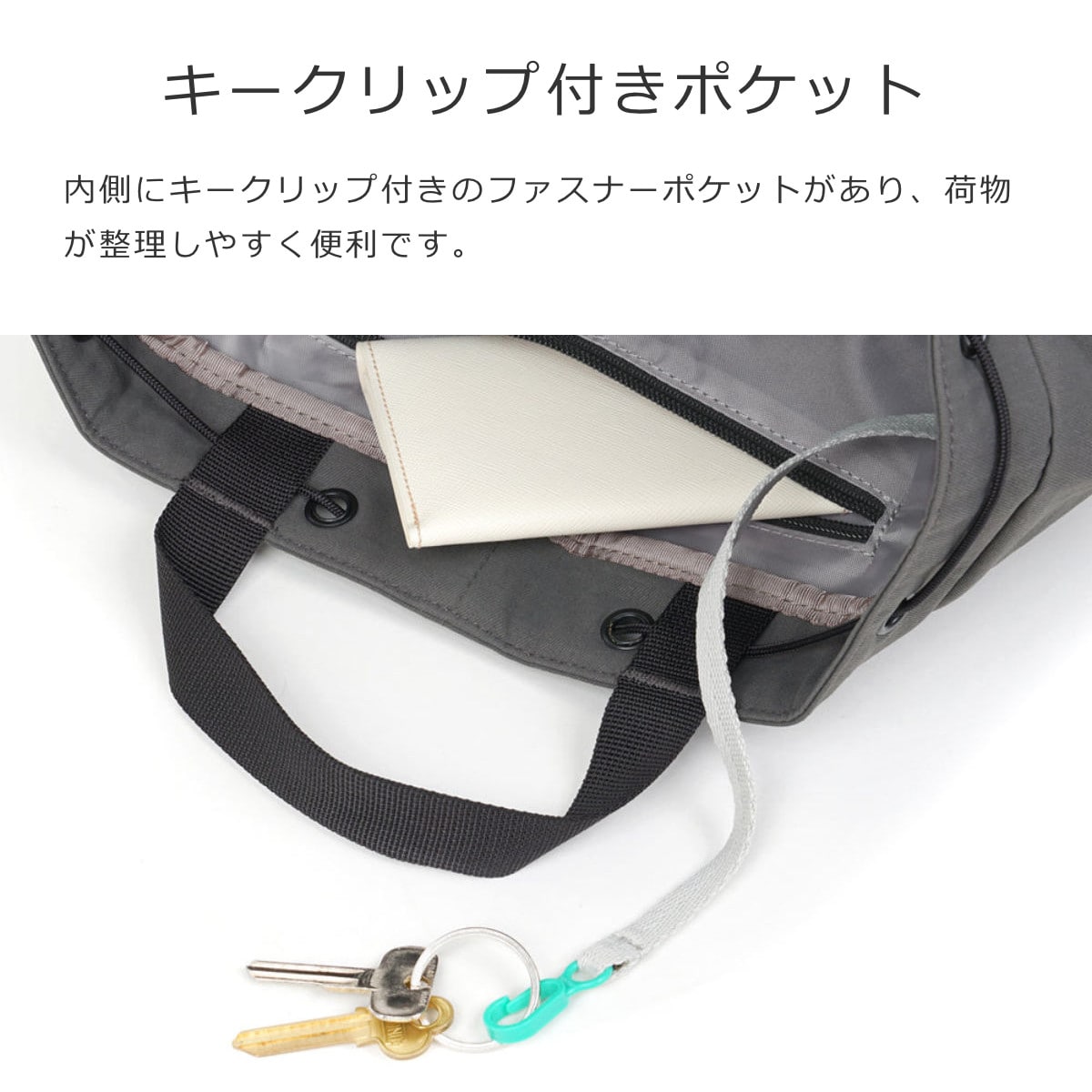 内側にはキークリップ付きのファスナーポケットがあり、荷物が整理しやすく便利です。
