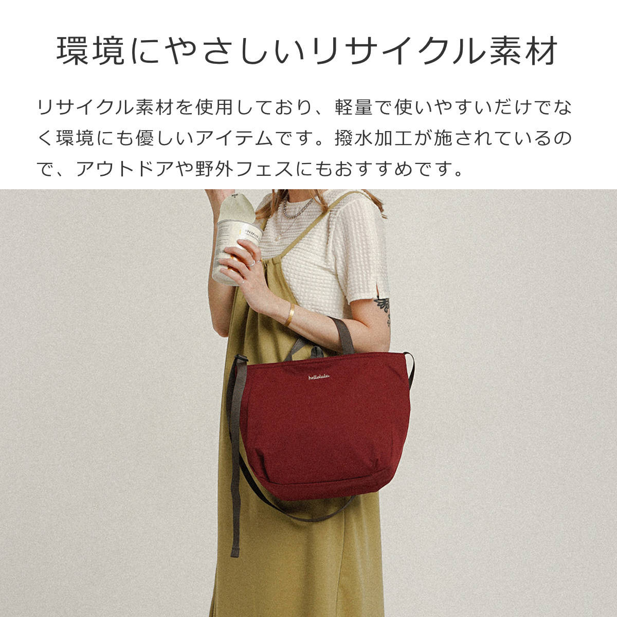 リサイクルしたポリエステル素材を使用しており、軽量で使いやすいだけでなく環境にも優しいアイテムです。撥水加工が施されているので、アウトドアや野外フェスにもおすすめです。
