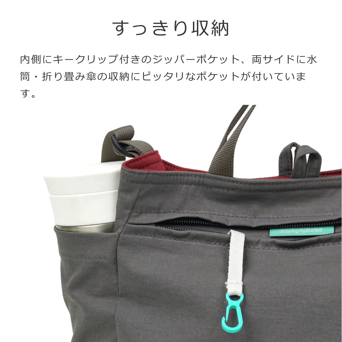 ジッパーポケットの内側には便利なキークリップ付きです。両サイドのポケットは水筒や折り畳み傘の収納にピッタリです。