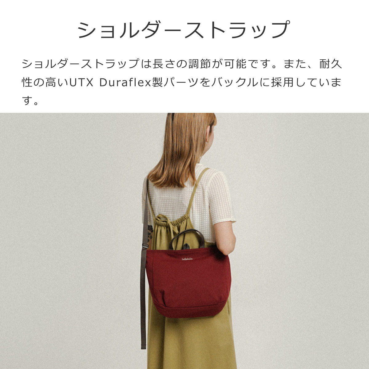 ショルダーストラップは長さ調節が可能です。バックルには耐久性の高いUTX Duraflex製パーツを採用しています。