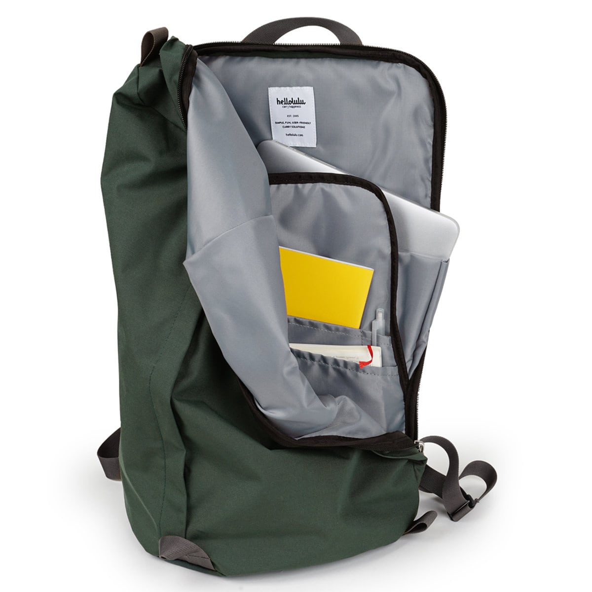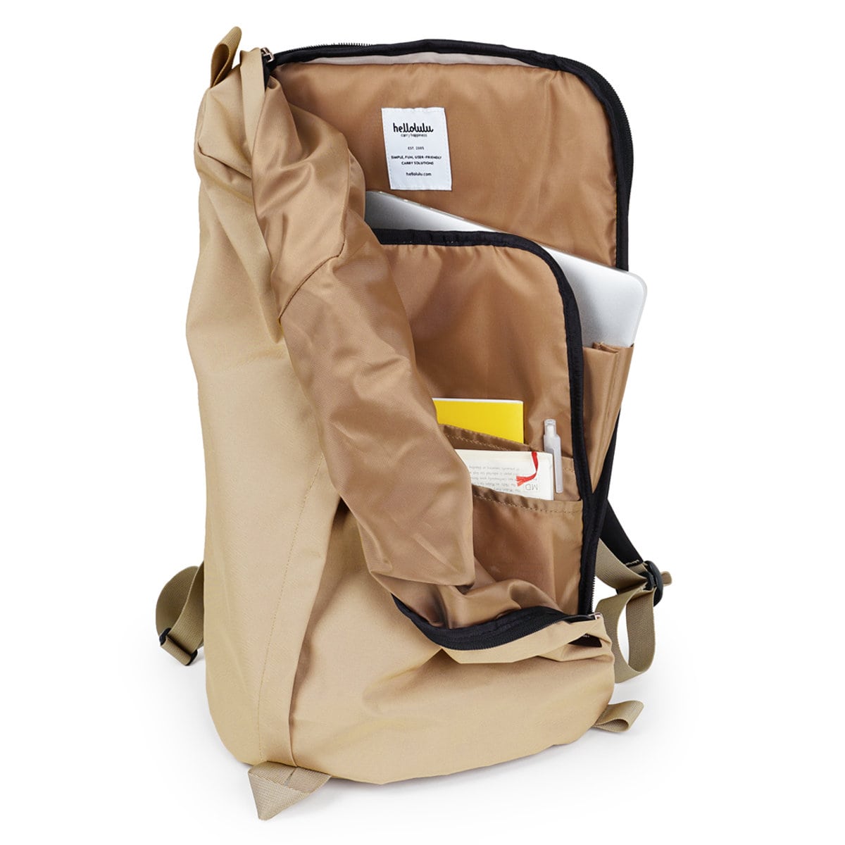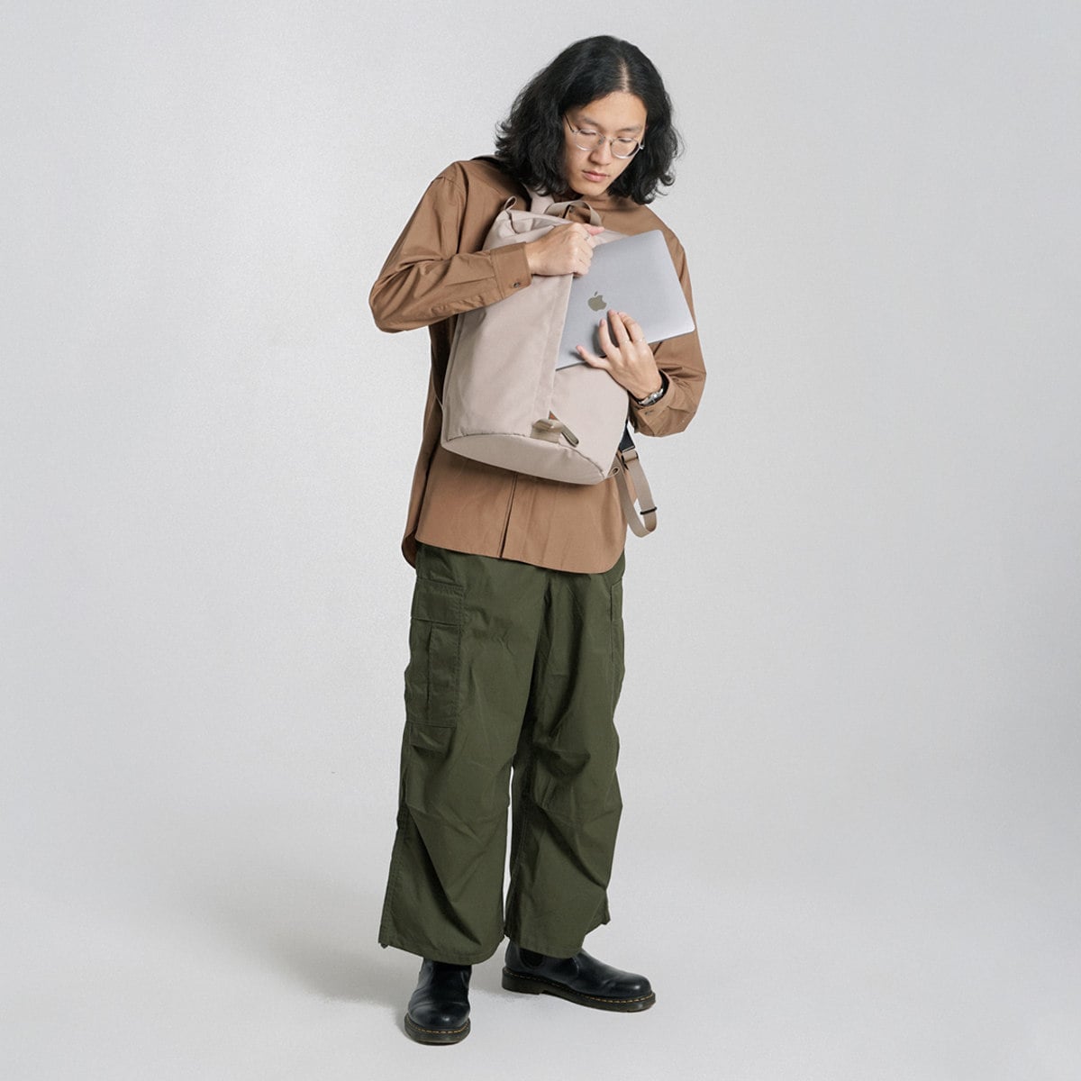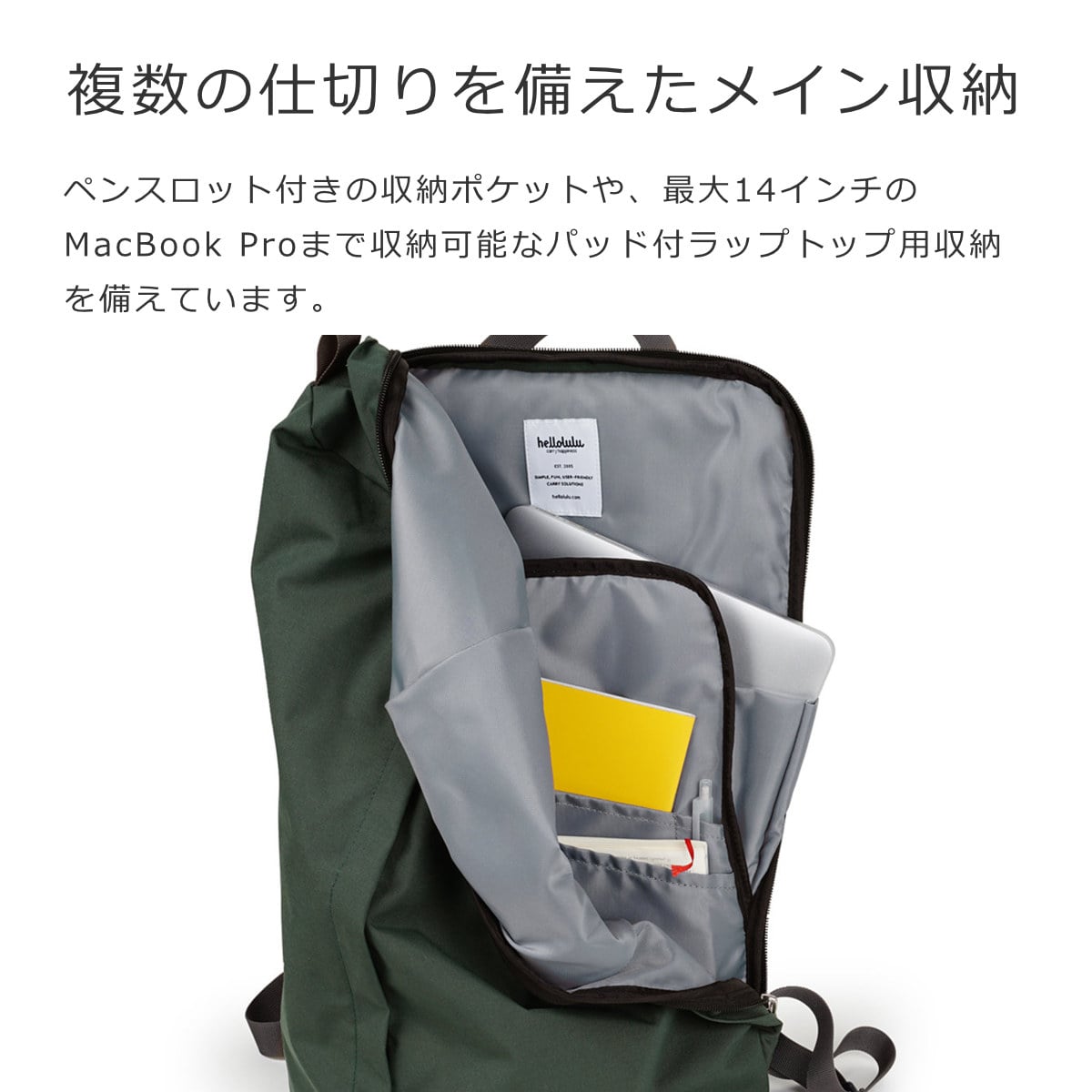内側にはペンスロット付きの収納ポケットや、最大14インチのMacBook Proまで収納可能なパッド付ラップトップ用収納(幅31.3×奥行1.6×高さ22.2cm)を備えています。