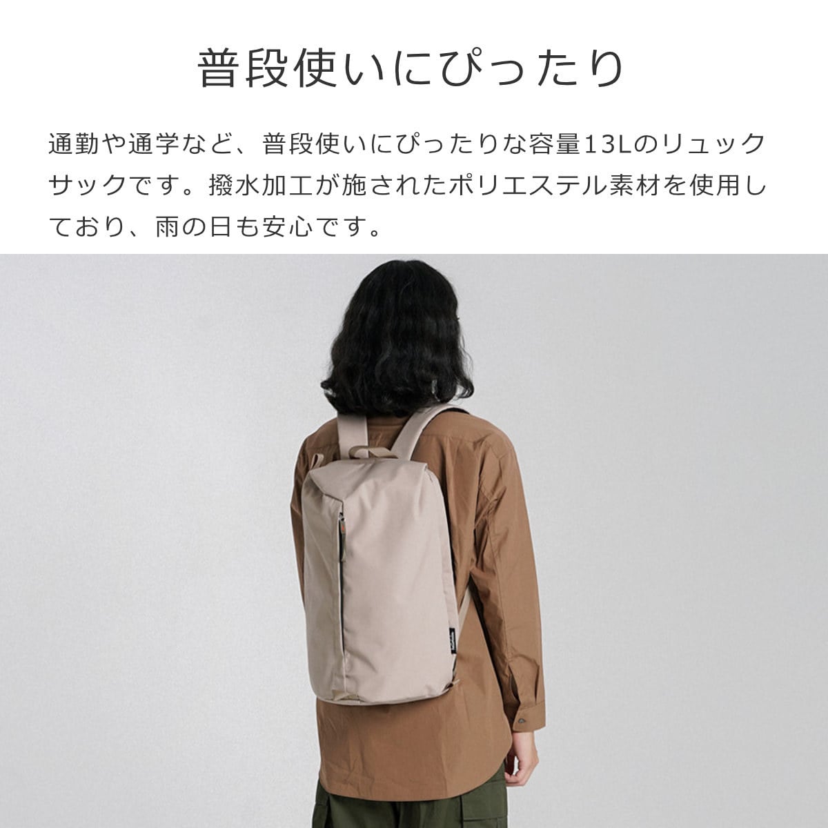 通勤や通学など、普段使いにぴったりな容量13Lのリュックサックです。ポリエステル素材を使用しており、軽量で使いやすいだけでなく、撥水加工が施されているので雨の日も安心です。旅行やレジャー、アウトドアにもおすすめです。