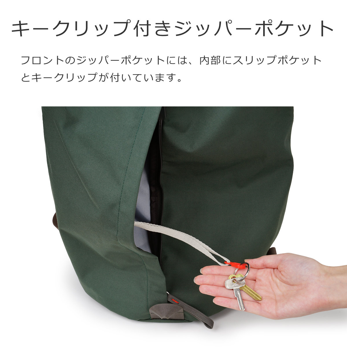 フロントのジッパー付きポケットには、内部にスリップポケットとキークリップが付いています。良く使うものを収納するとサッと取り出せて便利です。
