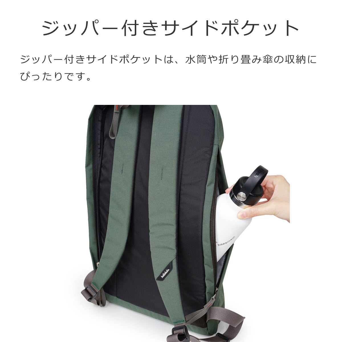 ジッパー付きサイドポケットは、水筒や折り畳み傘の収納にぴったりです。