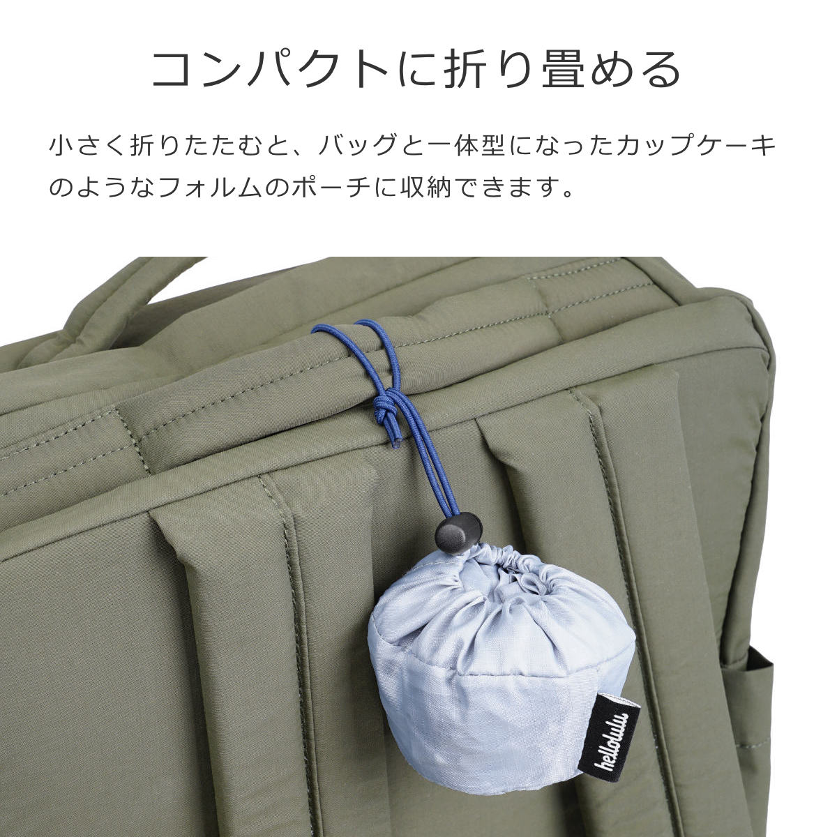 小さく折りたたむと、バッグと一体型になったカップケーキのようなフォルムのポーチに収納できます。