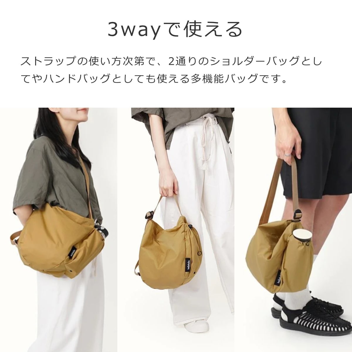 ストラップの使い方次第で、2通りのショルダーバッグとしてやハンドバッグとしても使える多機能バッグです。