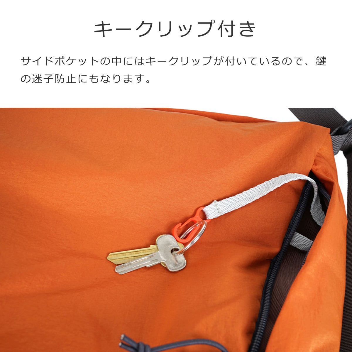 サイドポケットの中にはキークリップが付いているので、鍵の迷子防止にもなります。
