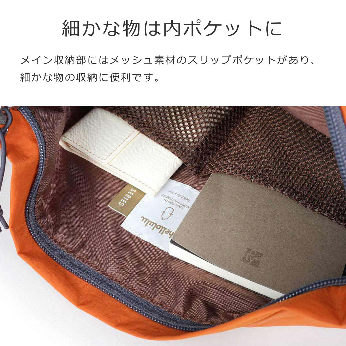 メイン収納部にはメッシュ素材のスリップポケットがあり、細かな物の収納に便利です。