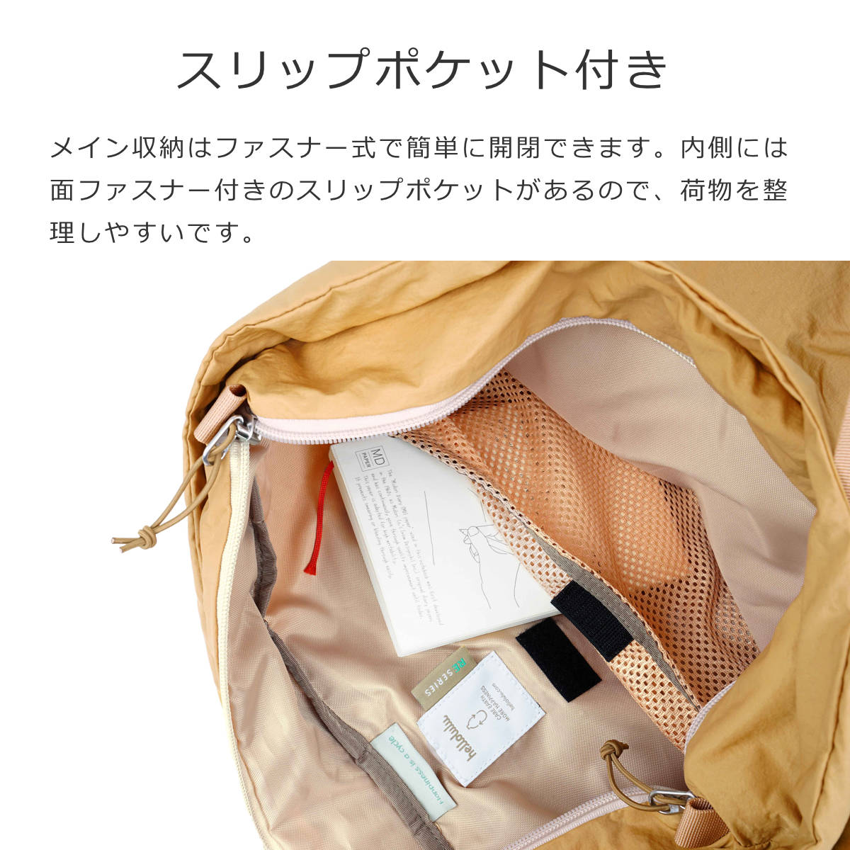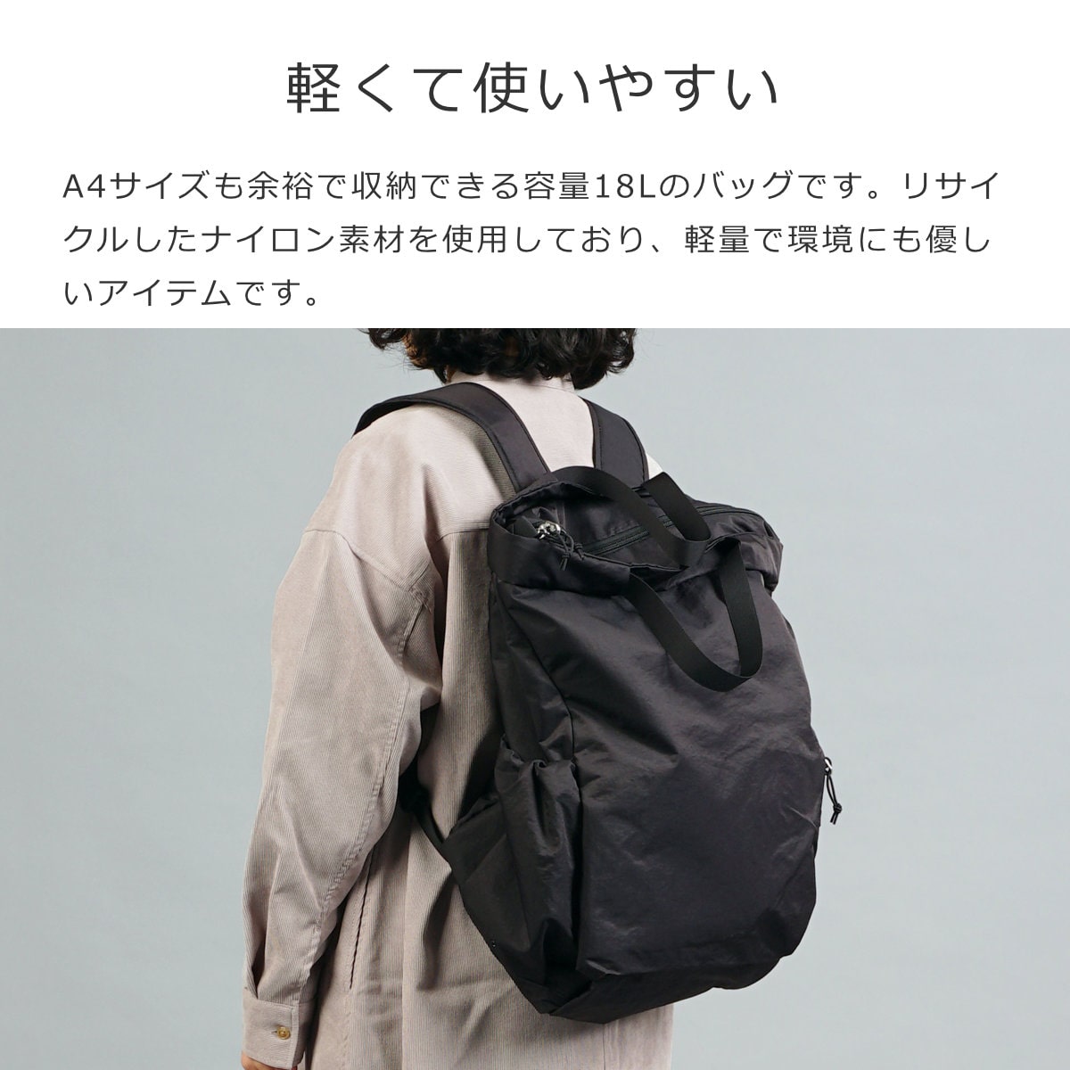 メイン収納は雑誌や書類など、A4サイズも余裕をもって収納できる容量18Lです。表地はリサイクルしたナイロン素材を使用しており、軽量で使いやすいだけでなく環境にも優しいアイテムです。