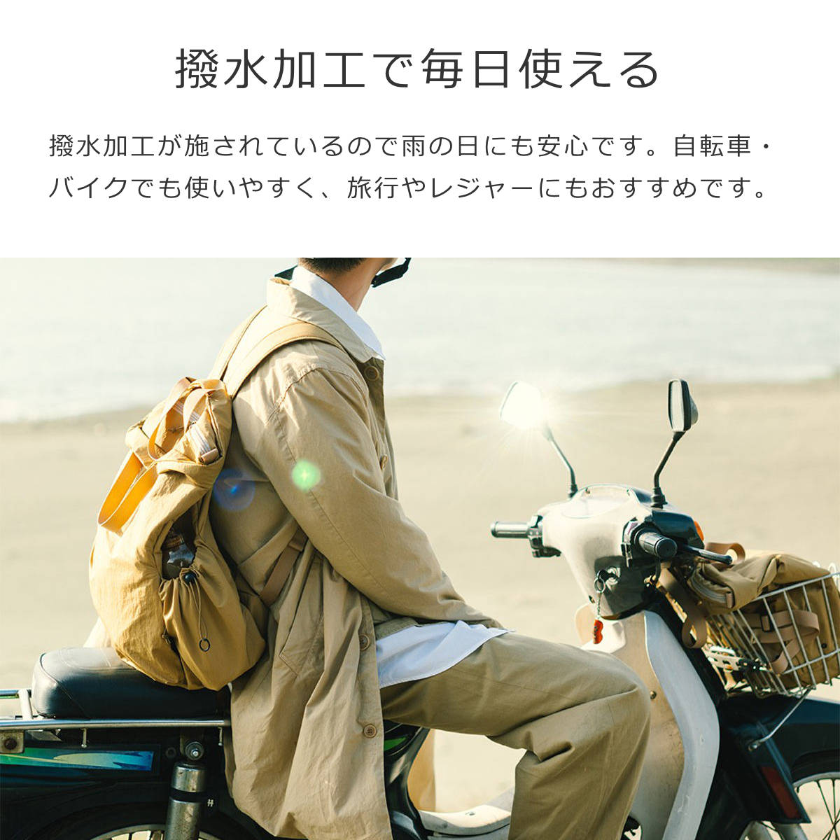 撥水加工が施されているので雨の日にも安心です。自転車・バイクでも使いやすく、旅行やレジャーにもおすすめです。