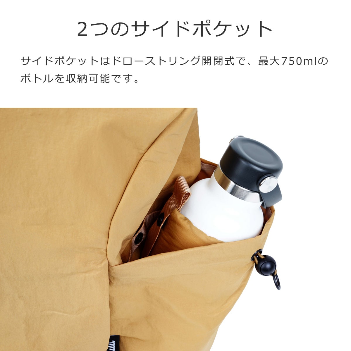 サイドポケットはドローストリング開閉式で、最大750mlのボトルを収納可能です。しっかりホールドできるので落下の心配がなく安心です。