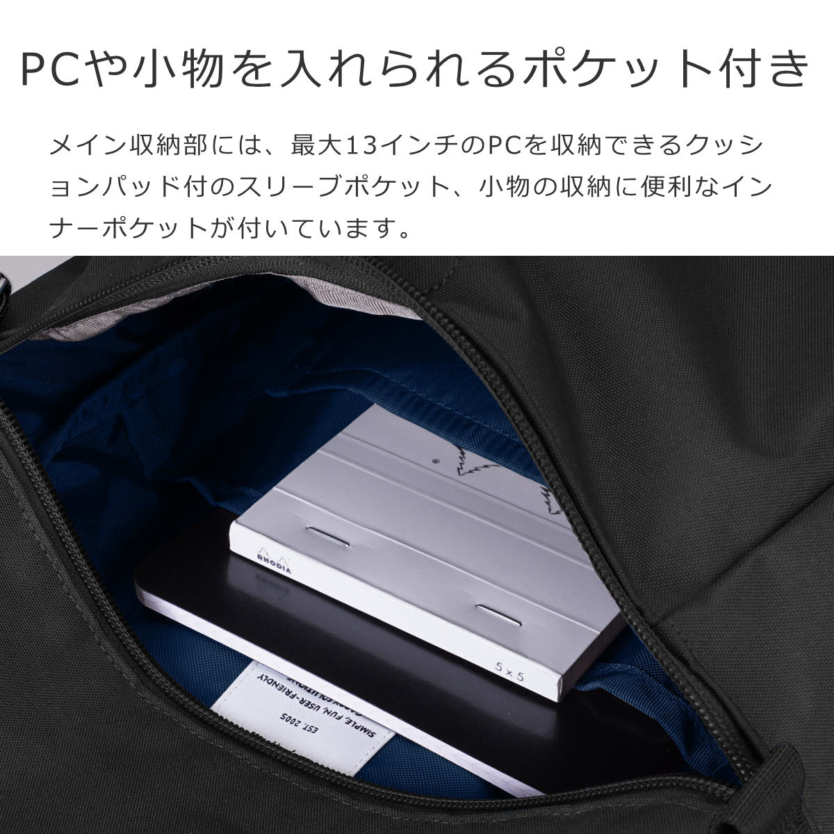 マグネットで止められているロールトップを開くとメイン収納部に繋がるファスナーがあります。メイン収納部には最大13インチのPCを収納できるクッションパッド付のスリーブポケット、小物の収納に便利なインナーポケットが付いています。