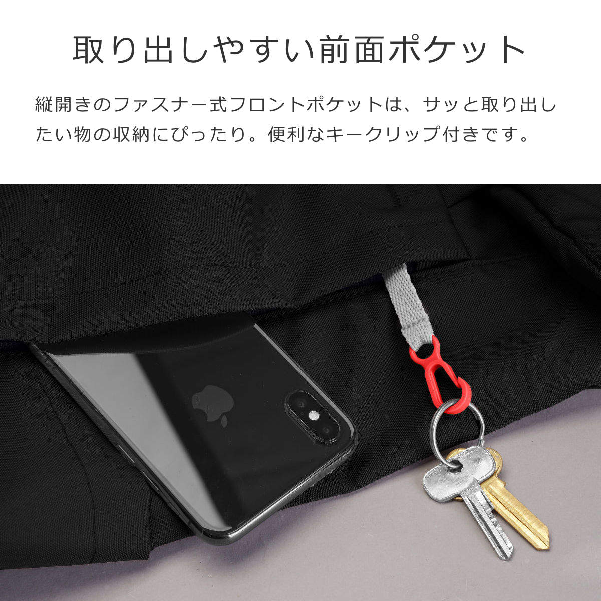 縦開きのファスナー式フロントポケットは、携帯などのサッと取り出したい物の収納にぴったりです。鍵の紛失を防ぐキークリップ付きです。