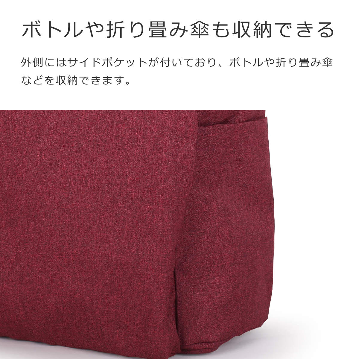 外側にはサイドポケットが付いており、ボトルや折り畳み傘などを収納できます。
