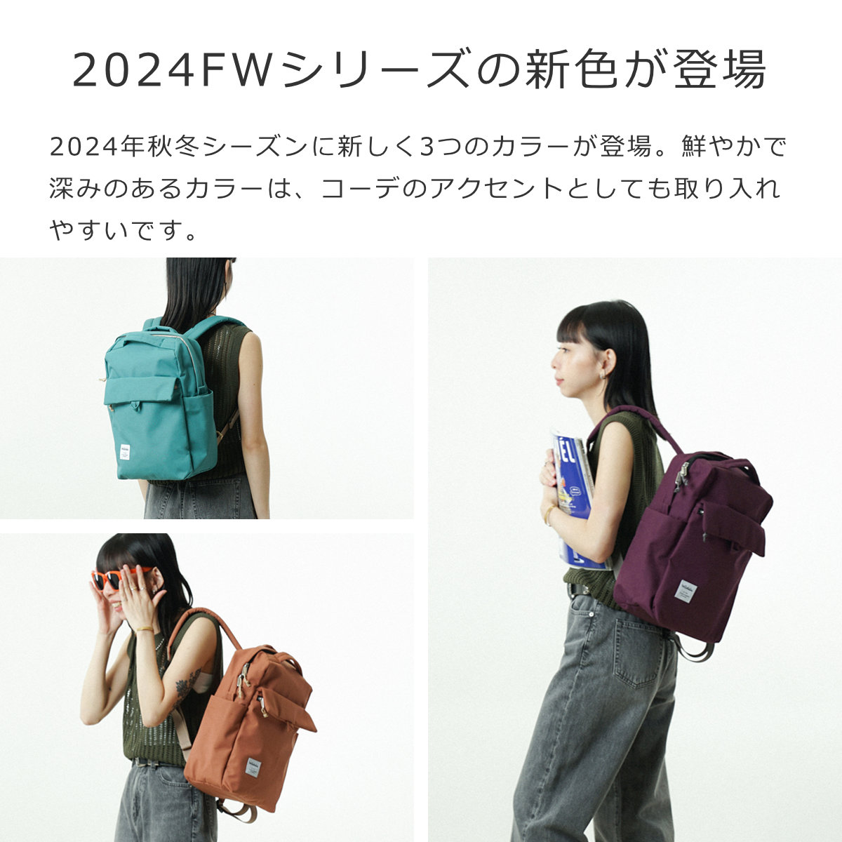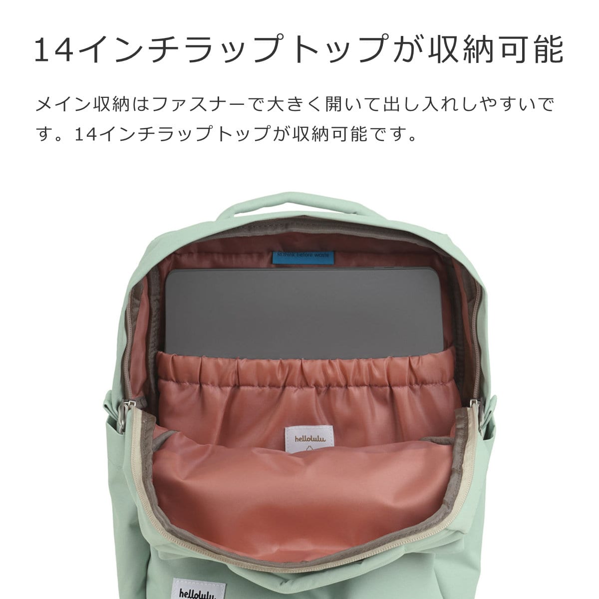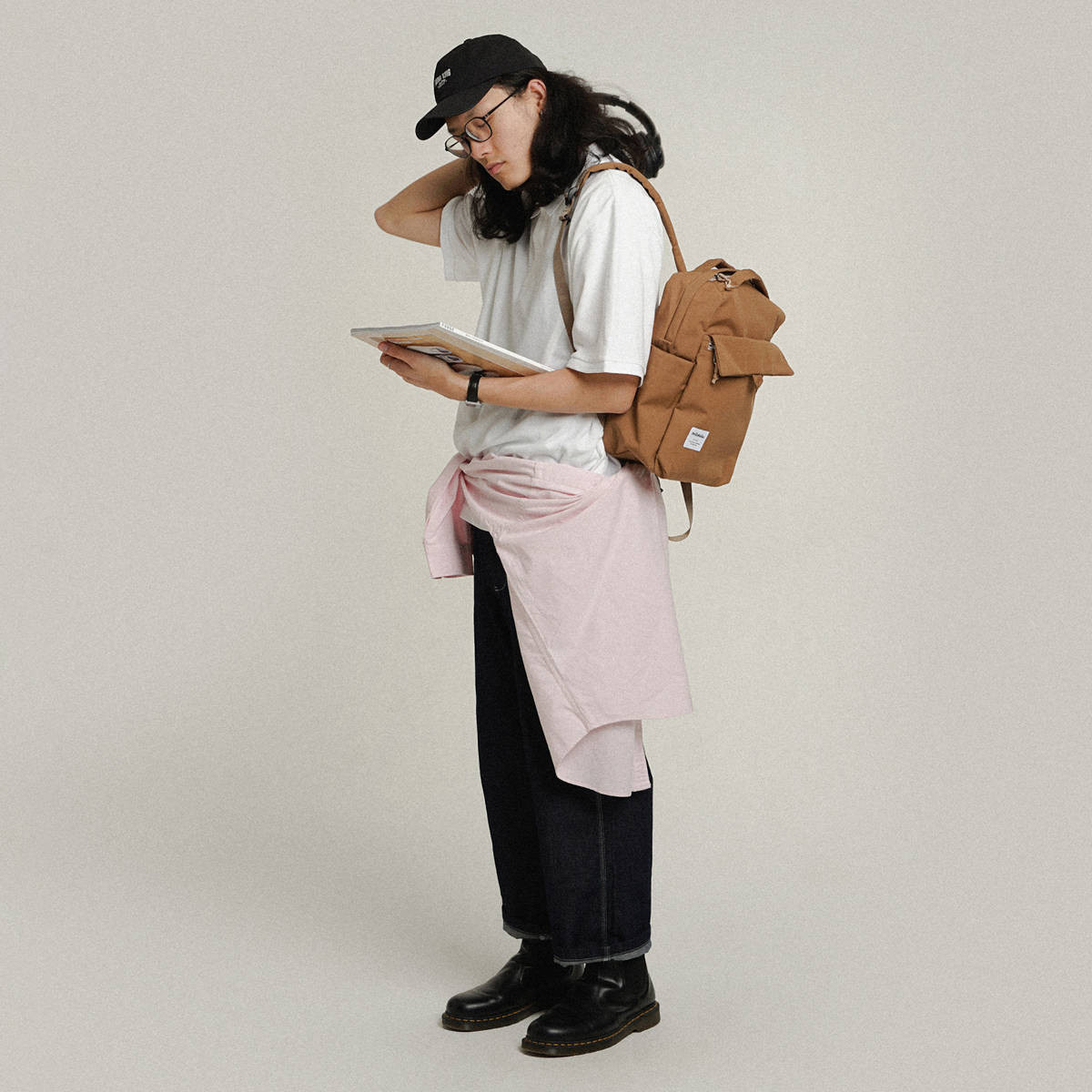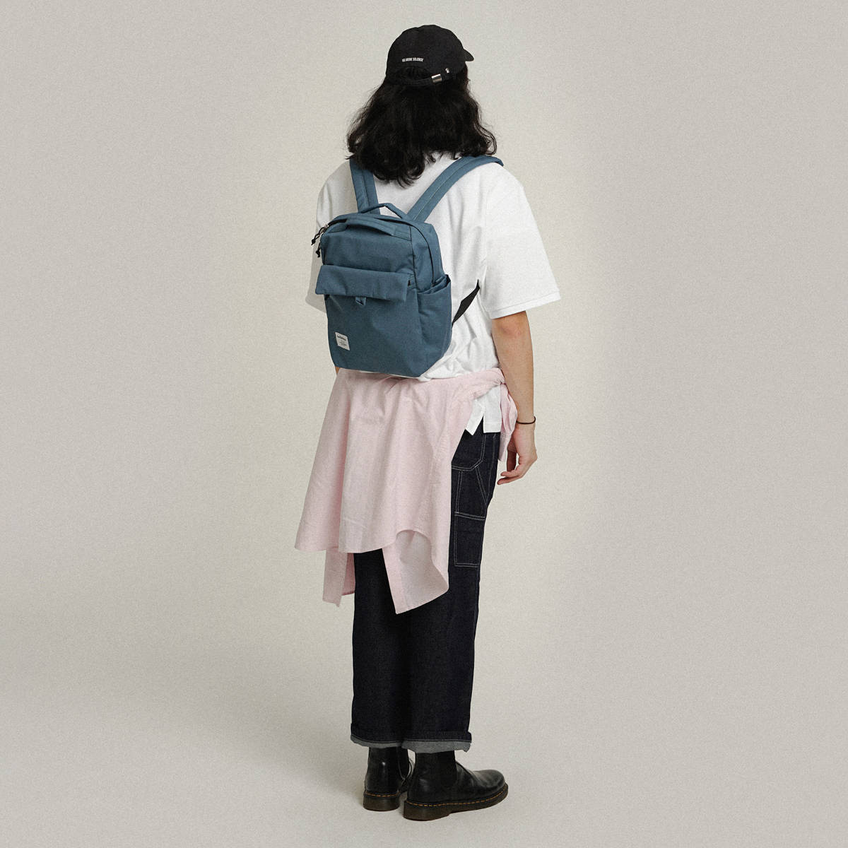 ポケットが充実していて機能的なスクエア型バックパックです。100%リサイクル素材を使用した生地には撥水加工が施されているので、急な雨でも安心です。