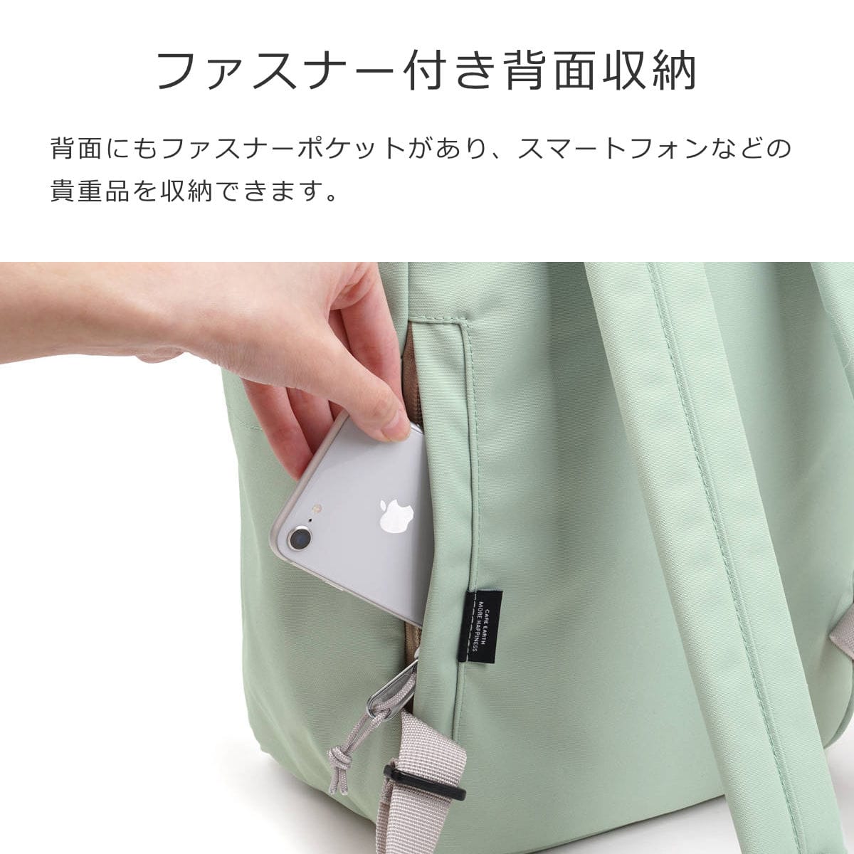 背面にもファスナーポケットがあり、スマートフォンなどの貴重品を収納できます。