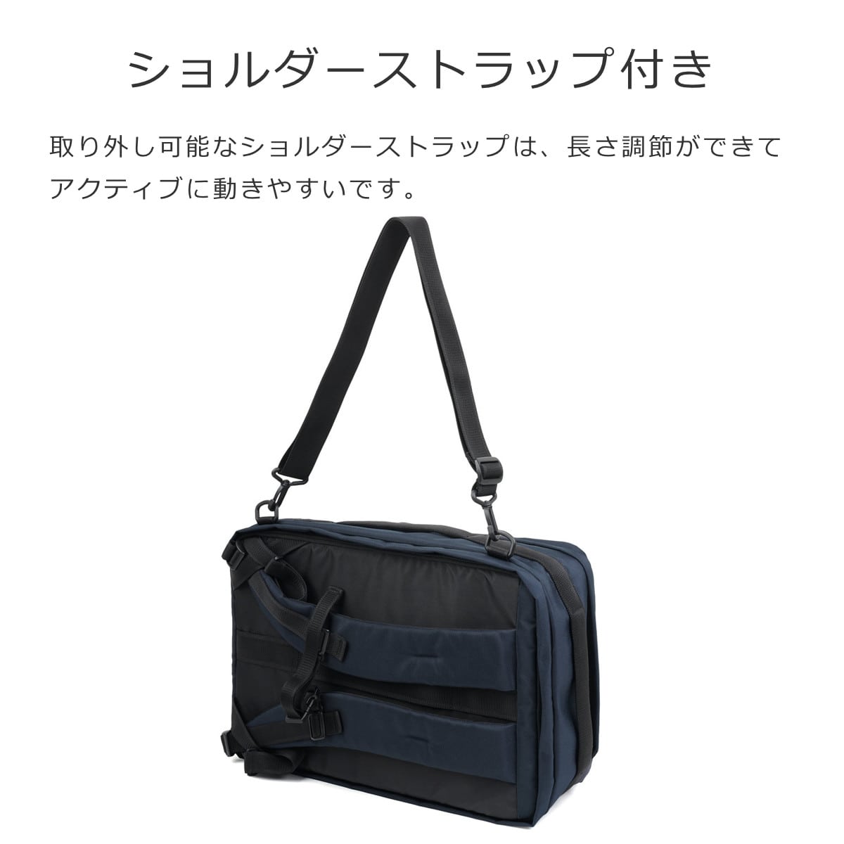 長さ調節可能なストラップ付きで、ショルダーバッグとしても使えます。アクティブに動きやすく、持っておくと重宝する3wayバッグです。