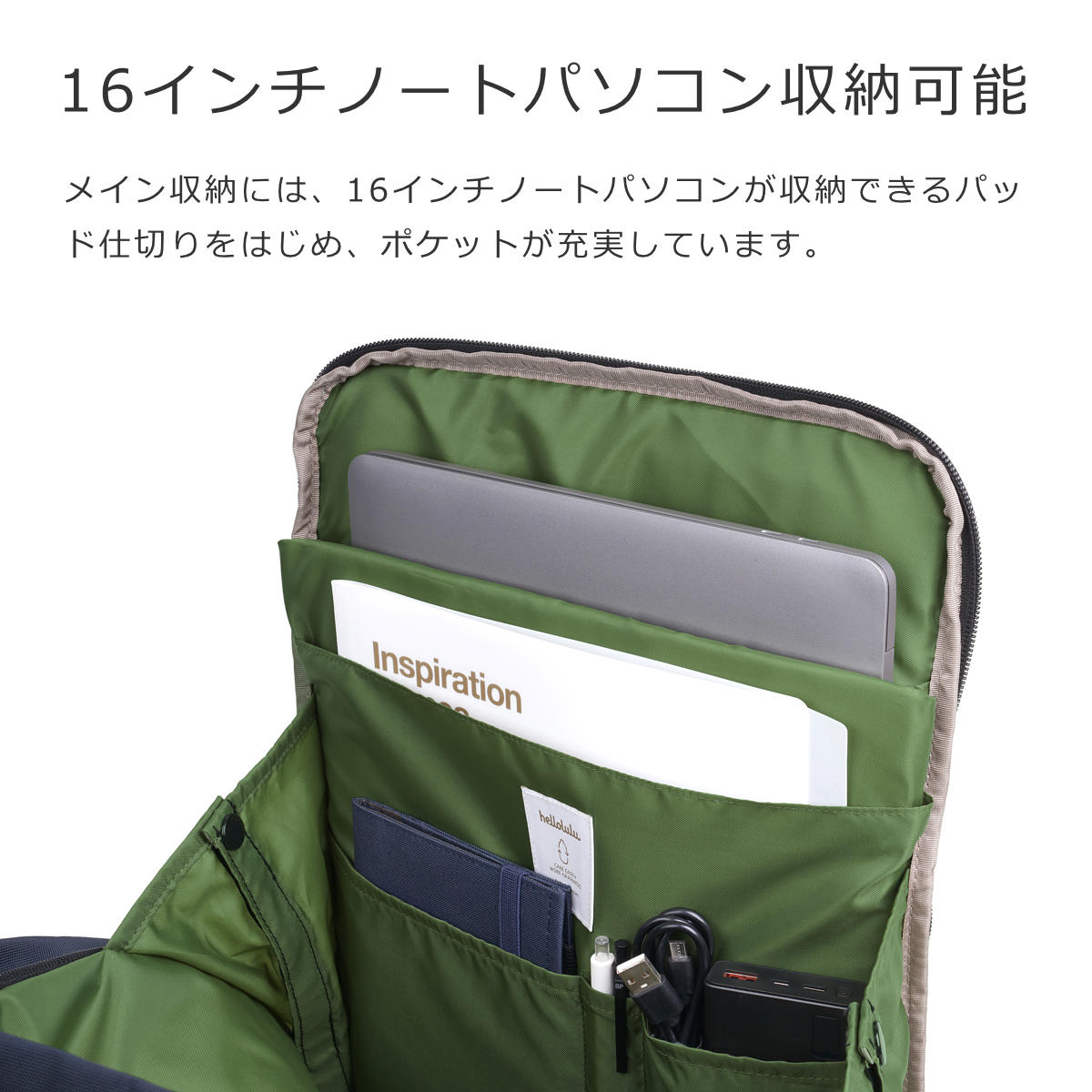 メイン収納には、16インチノートパソコンが収納できるパッド仕切りをはじめ、ポケットが充実しています。