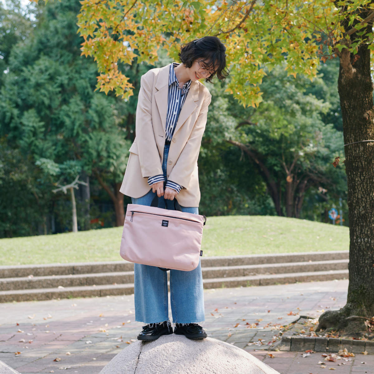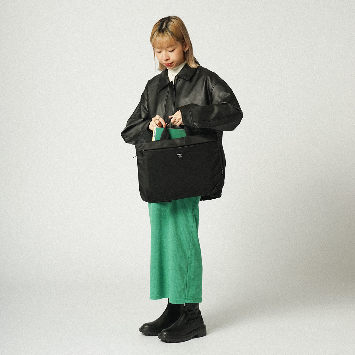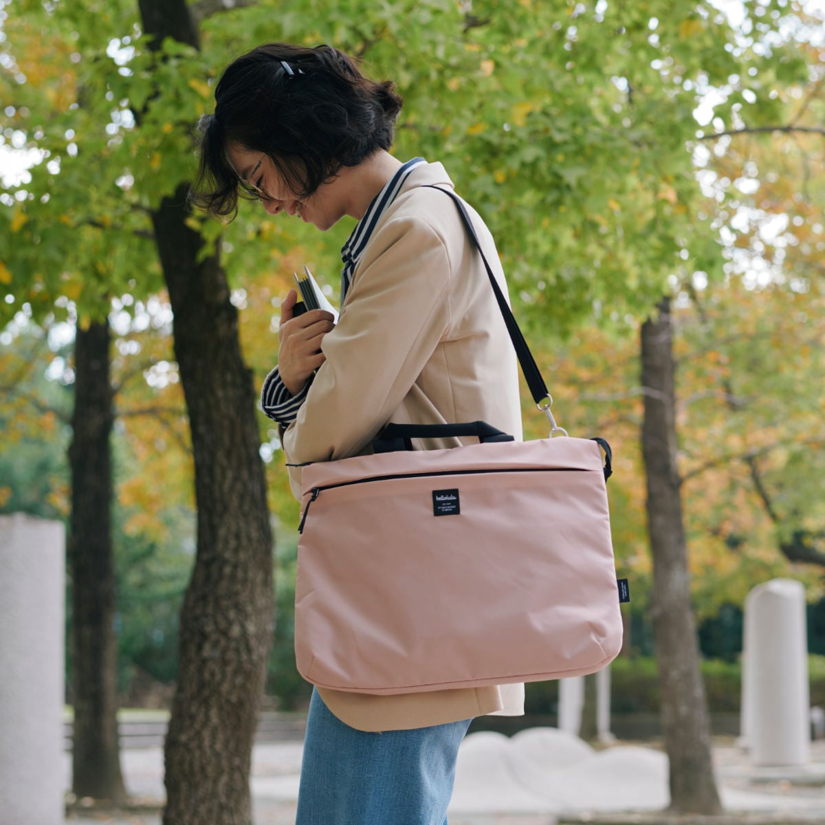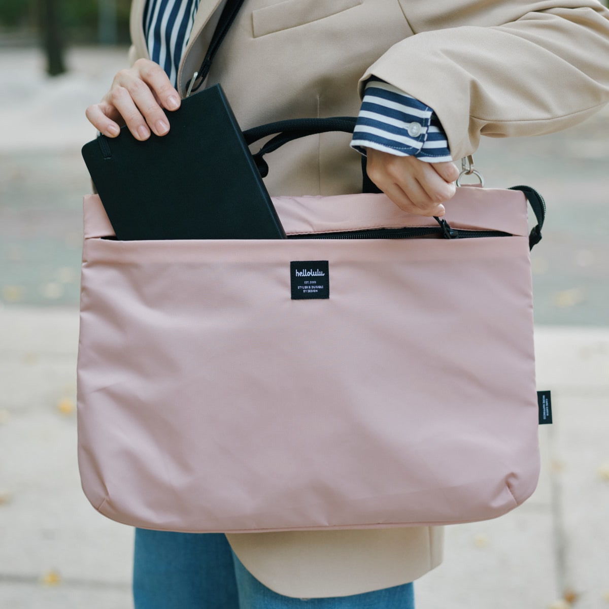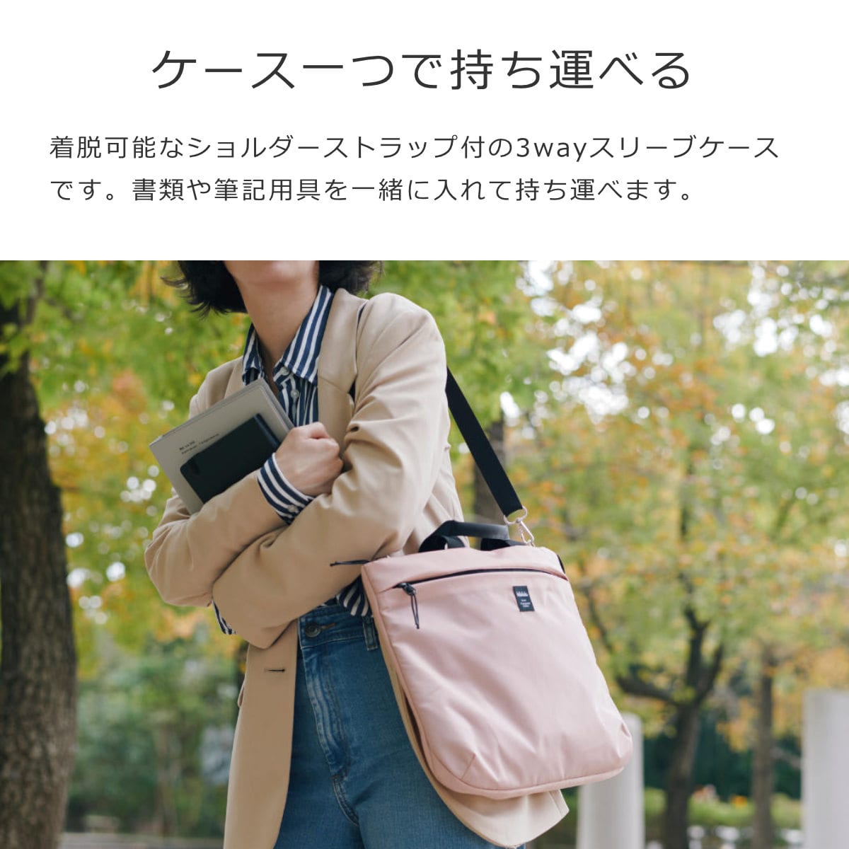 ショルダーストラップを付けて肩掛け、斜め掛けとして、ショルダーストラップを外して手持ちとして使える3wayスリーブケースです。書類や筆記用具を一緒に入れて持ち運べます。