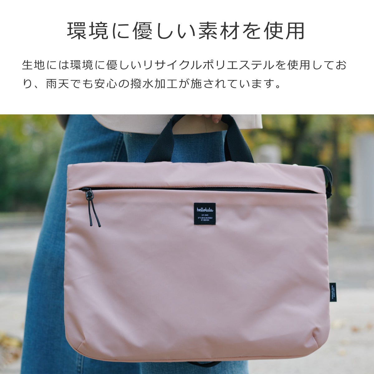 生地は環境に優しいリサイクルポリエステルを使用しています。雨天でも安心の撥水加工が施されているため、場所を選ばずお使いいただけます。
