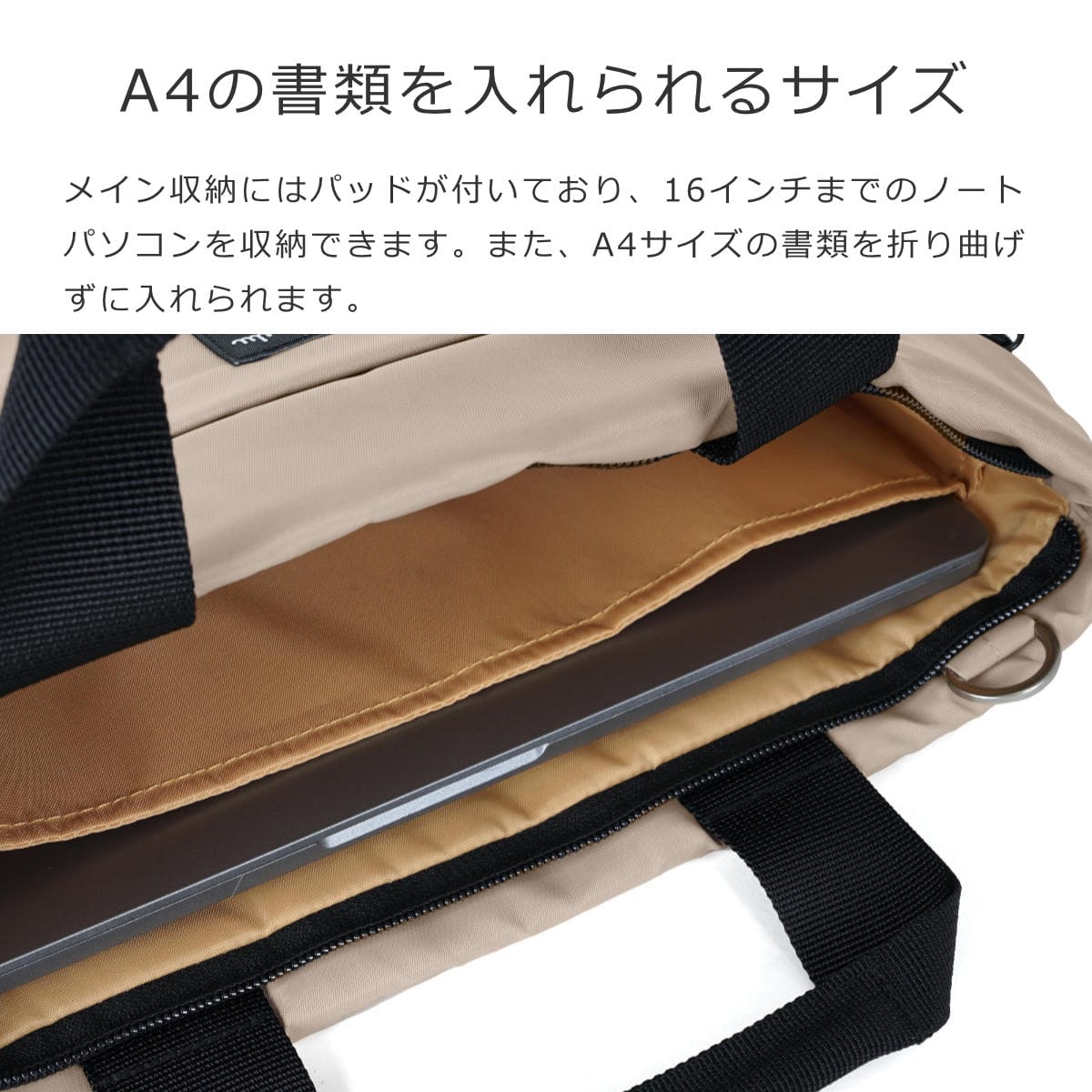 メイン収納にはパッドが付いており、16インチまでのノートパソコンを収納できます。また、A4サイズの書類を折り曲げずに入れられます。