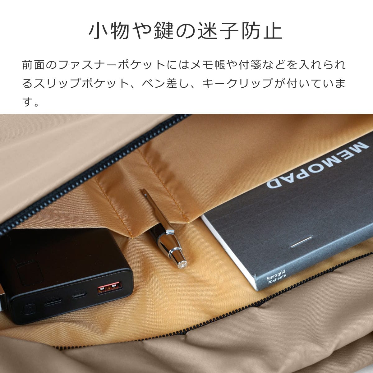 前面のファスナーポケットを開けると、メモ帳や付箋などを入れられるスリップポケット、ペン差し、キークリップが付いています。小物や鍵の迷子防止になります。
