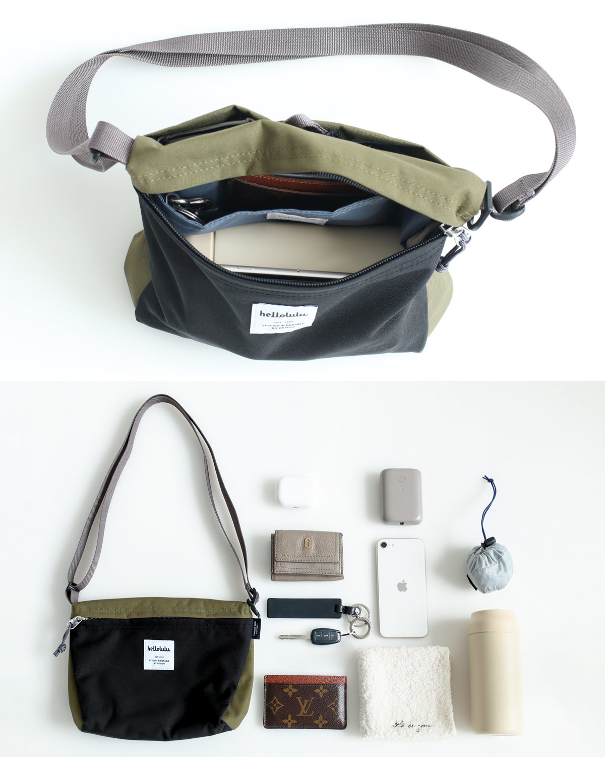 いつもの荷物に水筒・エコバッグ・モバイルバッテリーも入り、コンパクトながらも見た目以上に収納力があります。ちょっとしたレジャーやお子様とのお出かけにも大活躍します。