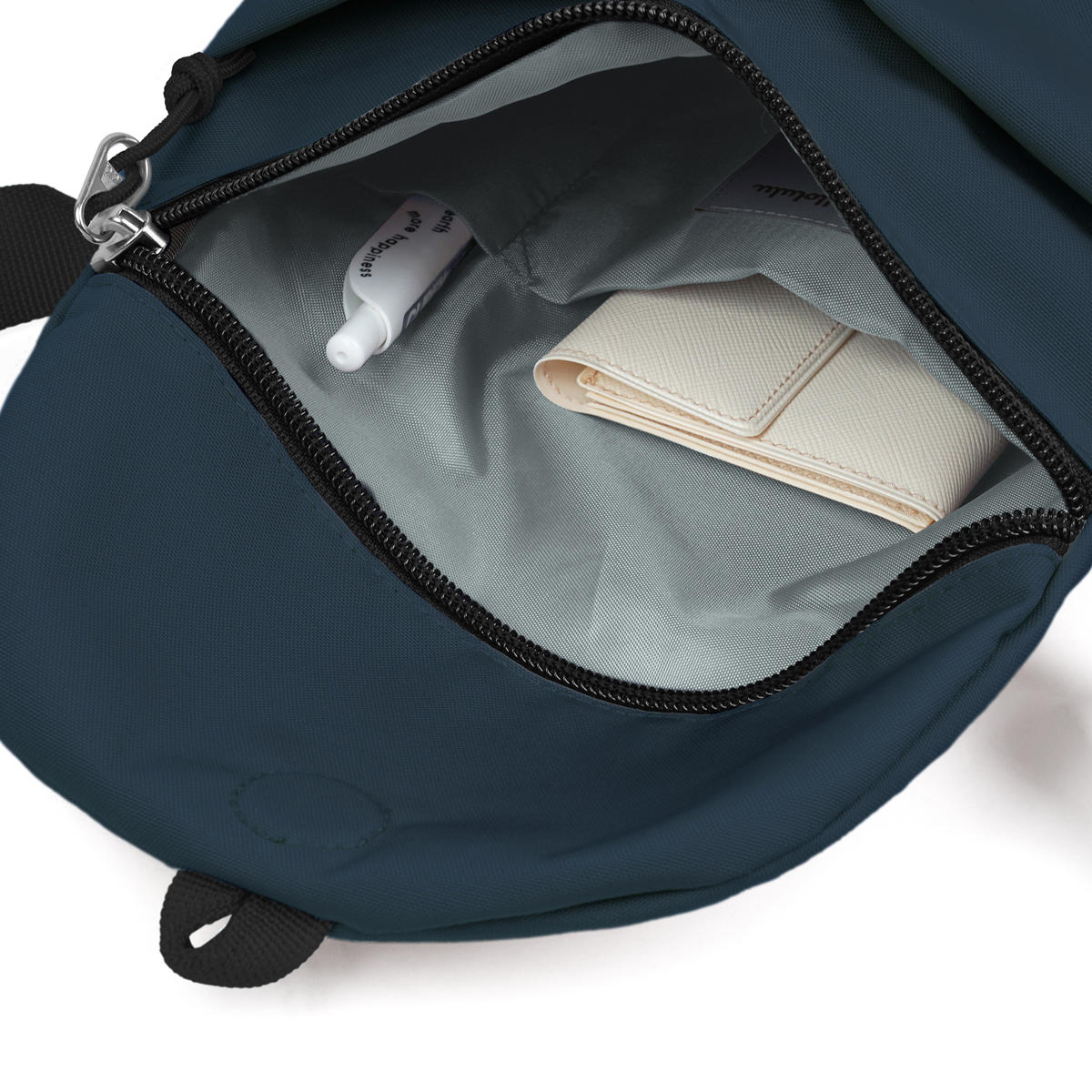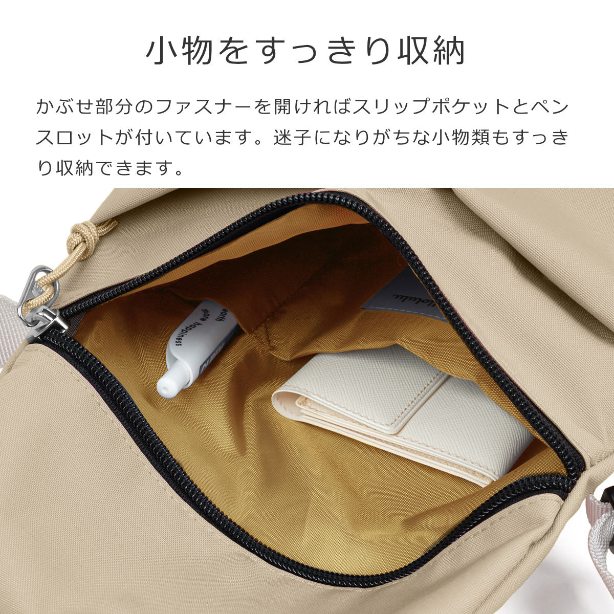 かぶせ部分のファスナーを開ければ、スリップポケットとペンスロットが付いています。迷子になりがちな小物類もすっきり収納できます。
