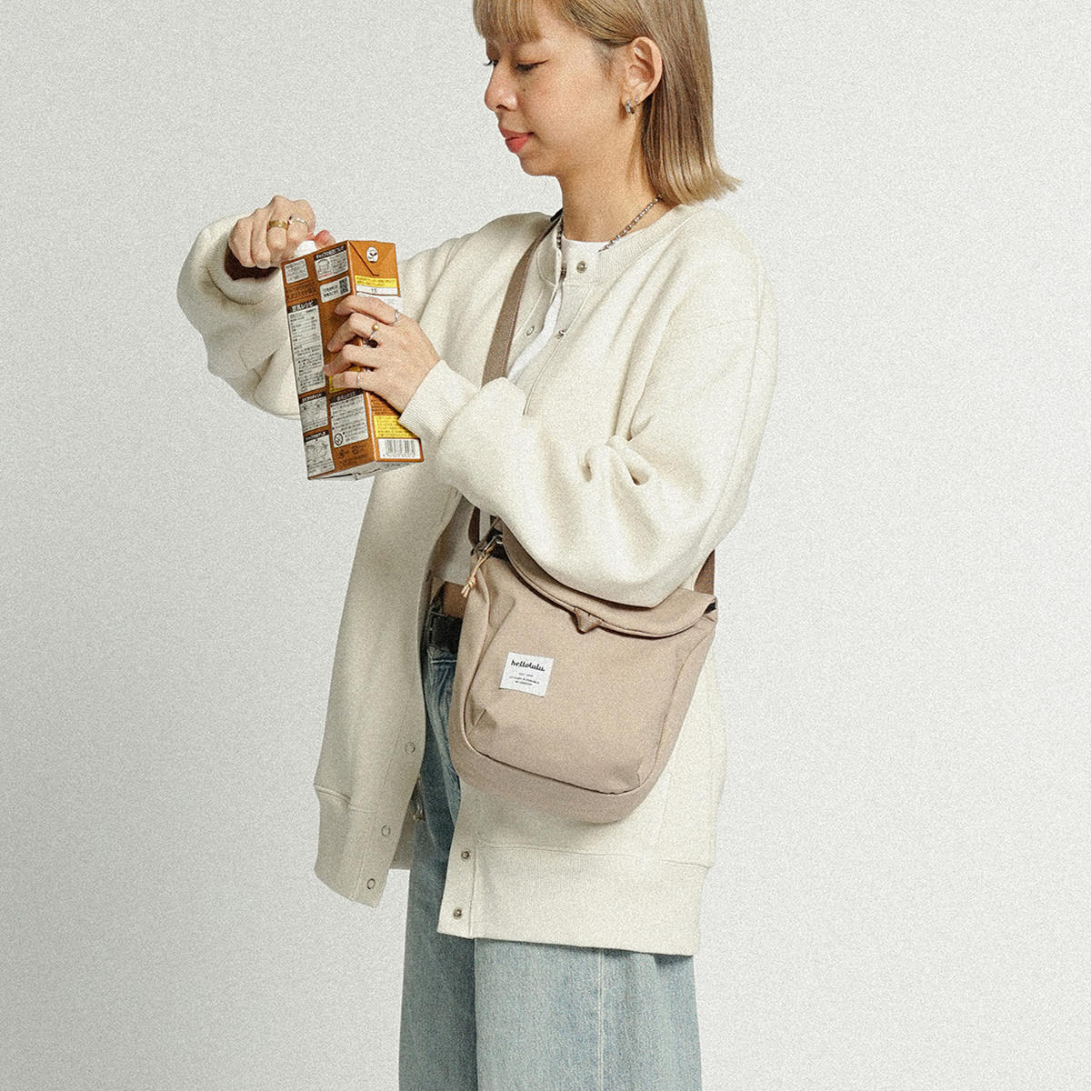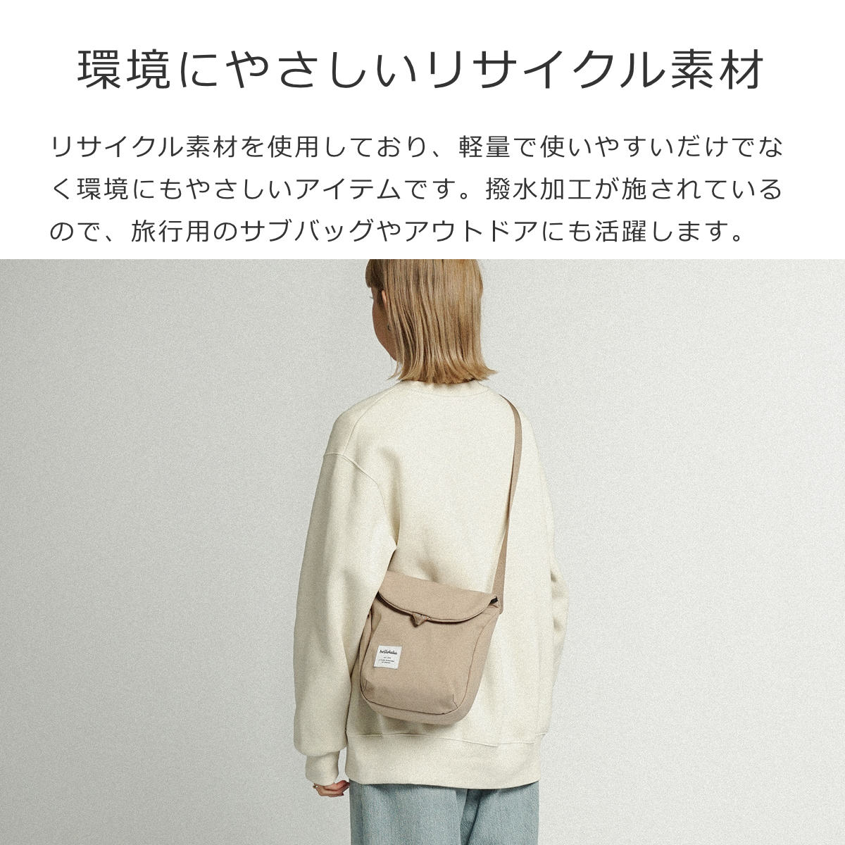 リサイクルしたポリエステル素材を使用しており、軽量で使いやすいだけでなく環境にもやさしいアイテムです。撥水加工が施されているので、旅行用のサブバッグやアウトドアにも活躍します。