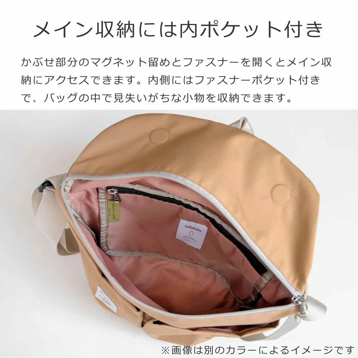 かぶせ部分のマグネット留めとファスナーを開くとメイン収納にアクセスできます。内側にはファスナーポケット付きで、目薬やリップなどバッグの中で見失いがちな小物を収納できます。