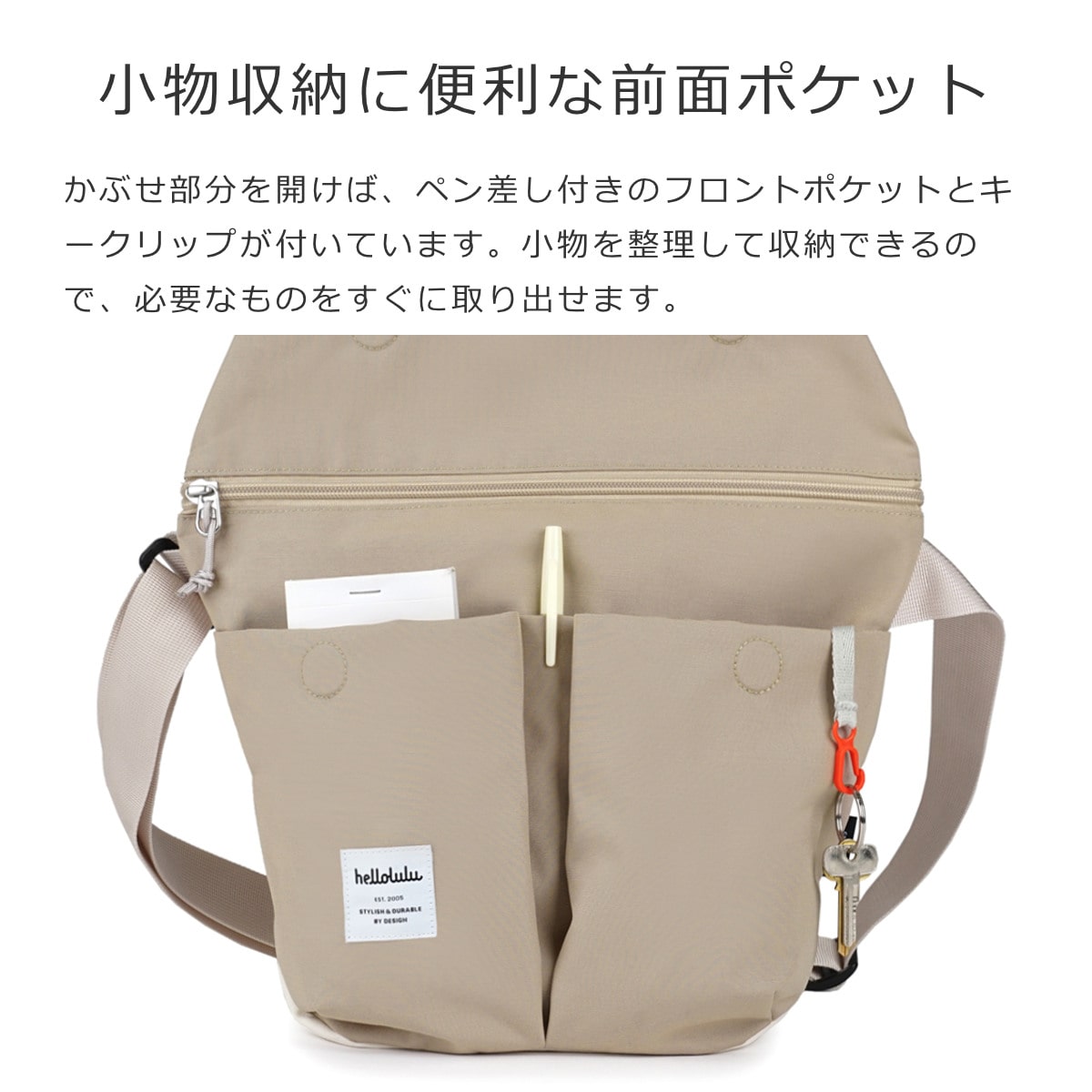 かぶせ部分を開けば、ペン差し付きのフロントポケットとキークリップが付いています。小物を整理して収納できるので、バッグの中で荷物がバラバラにならず、必要なものをすぐに取り出せます。