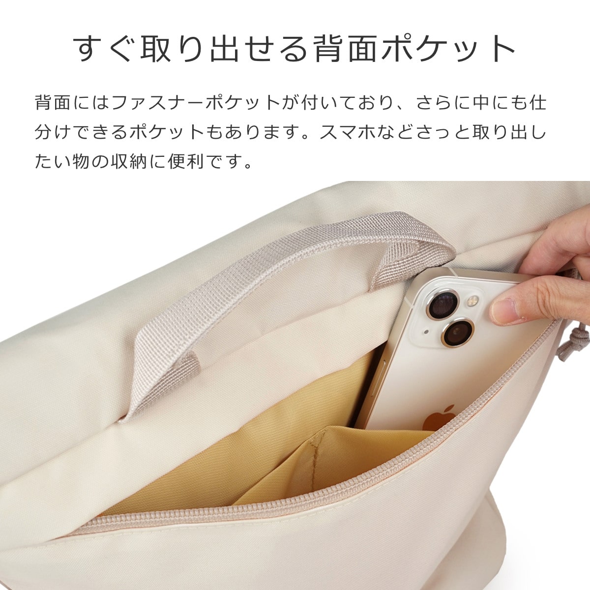 背面にはファスナーポケットが付いており、さらに中にも仕分けできるポケットもあります。スマホなどさっと取り出したい物の収納に便利です。