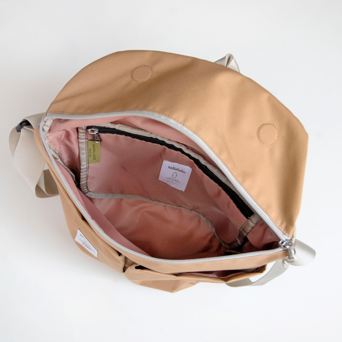 奥行14cmのしっかりとしたマチがあり、いつもの荷物に水筒、ポーチ、8インチのタブレットも入る見た目以上の収納力。計7個のポケットが付いており、お子様とのお出かけや荷物が多い時にも大活躍します。