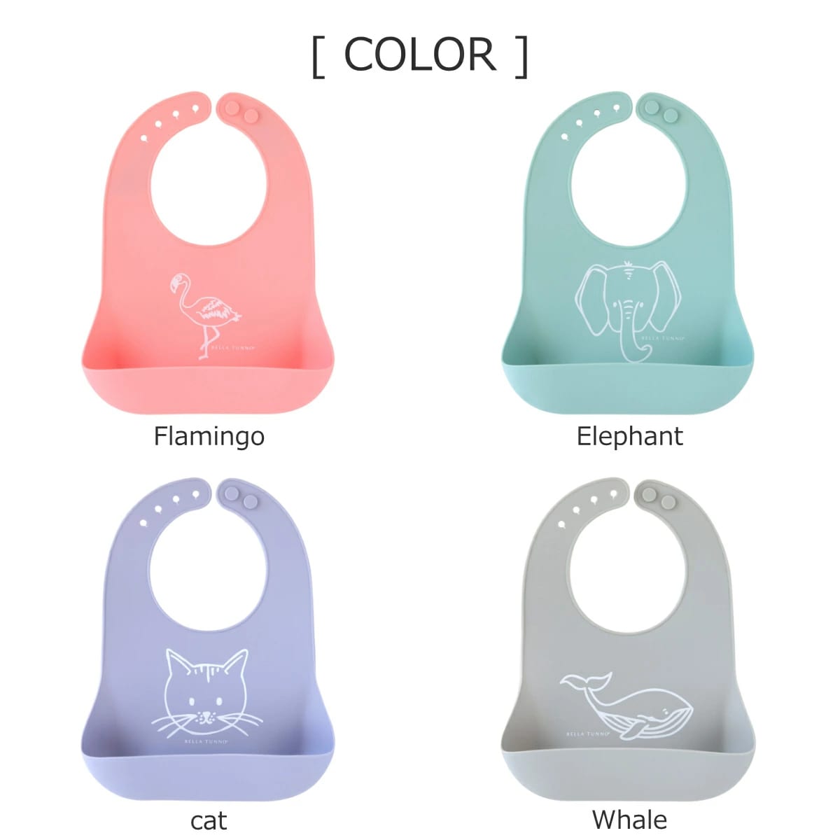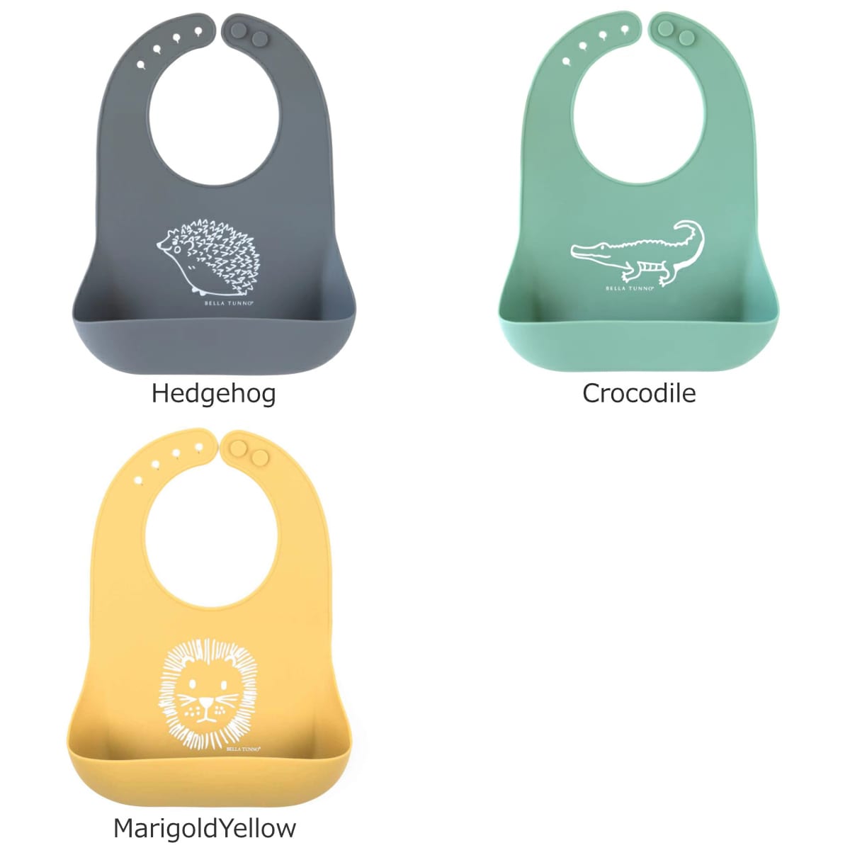 可愛いイラストが描かれたビブ。お食事の際や普段のよだれかけとしてお使いいただけます。柔らかく、丈夫な食品グレードシリコーンゴムで作られており、BPAフリー、PVCフリーで安全性も保証済です。
