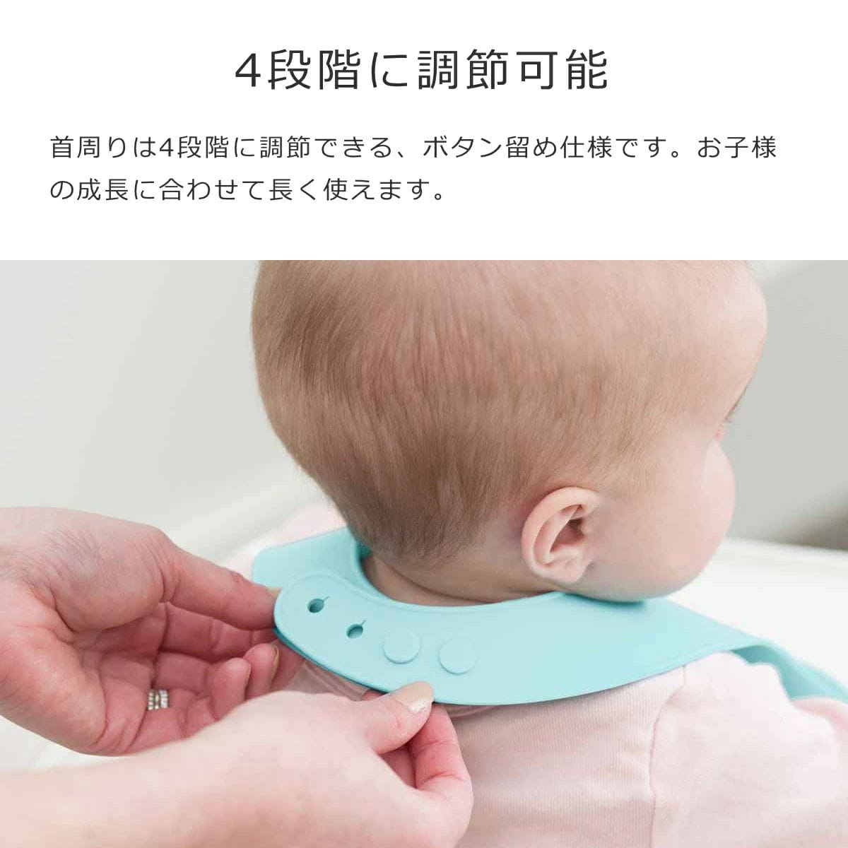 首周りは4段階に調節できる、ボタン留め仕様です。お子様の成長に合わせて長く使えます。