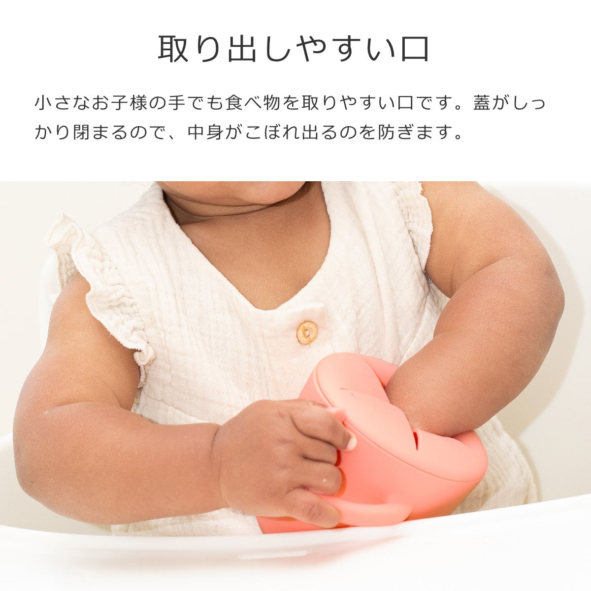 パチンと閉まる柔らかいシリコーン製の取り出し口は、小さなお子様の手でも食べ物を取り出しやすいです。蓋がしっかり閉まるので、中身がこぼれ出るのを防ぎます。