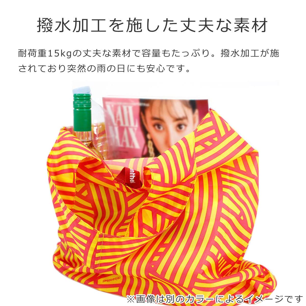 肩掛けもできる長さの丈夫な素材です。マチは約6cmあり、2Lペットボトルや卵パックなど奥行きのある物も安定します。耐荷重15kgの丈夫な素材で作られているので、重い物の持ち運びも安心です。