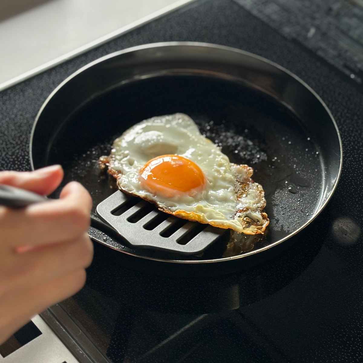 フチの高さは約2.5cmと浅いので、食材がひっくり返しやすいです。目玉焼きだけでなくホットケーキなどをひっくり返す際にも便利です。取り出しやすいので、お皿への盛り付けもスムーズにできます。