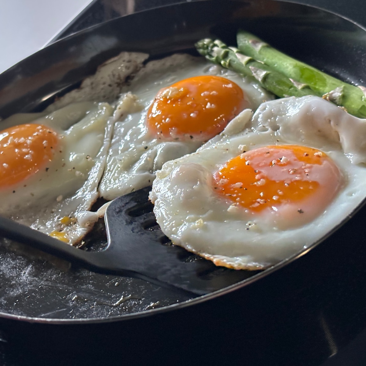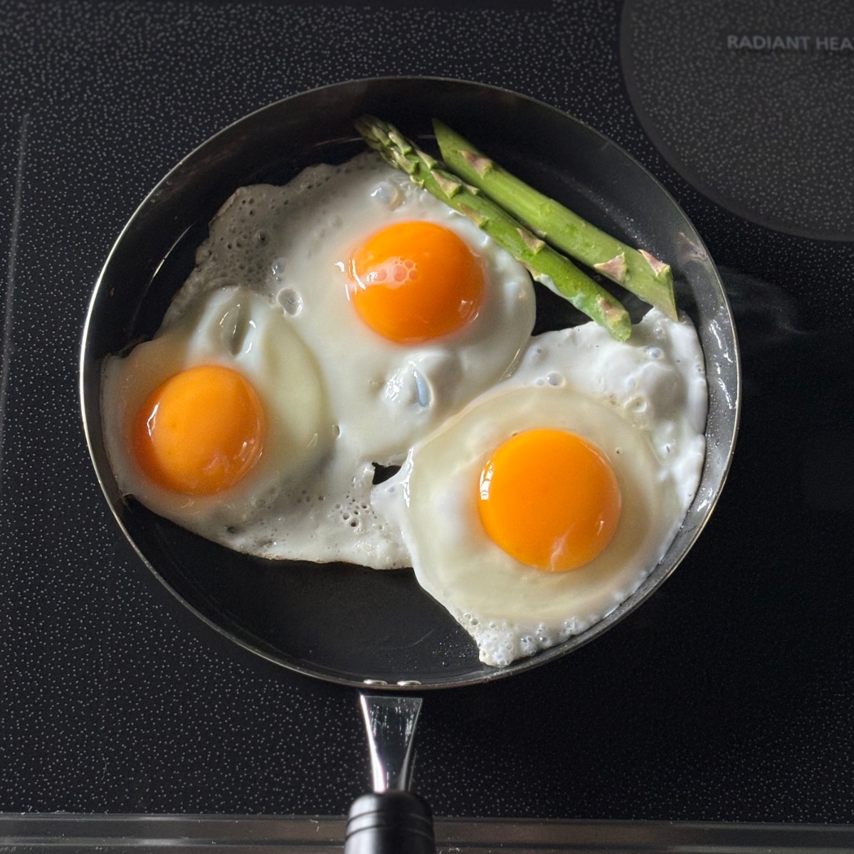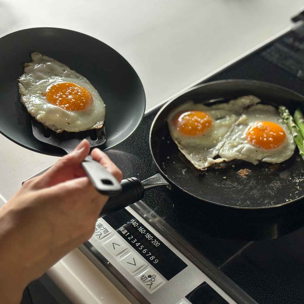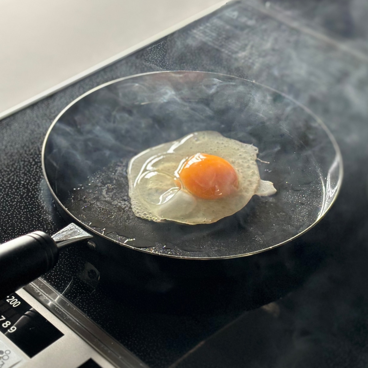 卵が美味しく焼ける温度はメイラード反応(タンパク質と糖を加熱することできつね色になる反応)が起こる160~180度と言われています。高温を維持しながら焼くことがポイントで、保温性の高い鉄フライパンだからこそ、より美味しく焼くことができます。