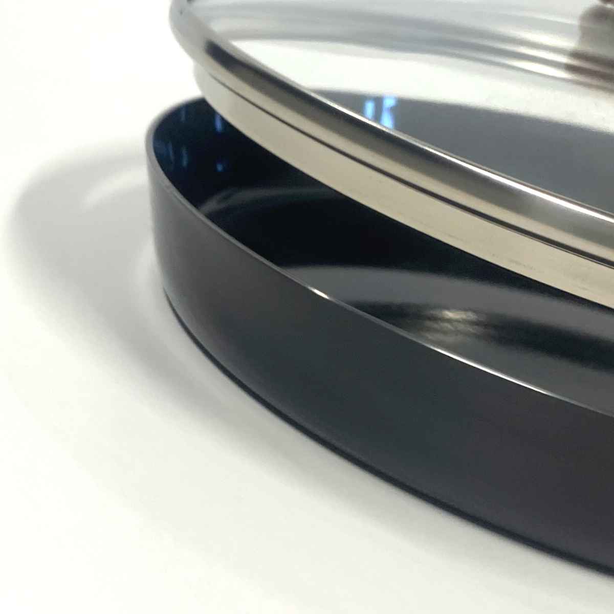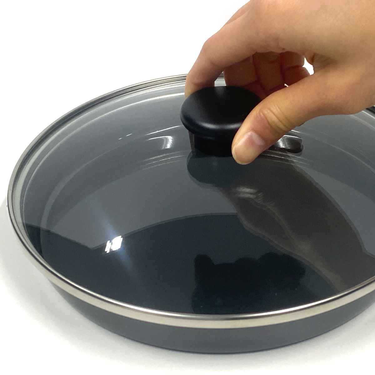 料理中の様子を確認できる便利なガラス蓋付きです。フライパンにぴったり合った蓋をすることでガタつかず、中までしっかり火を通すことができます。つまみはフェノール樹脂製で熱くなりにくく持ち上げやすいデザインです。