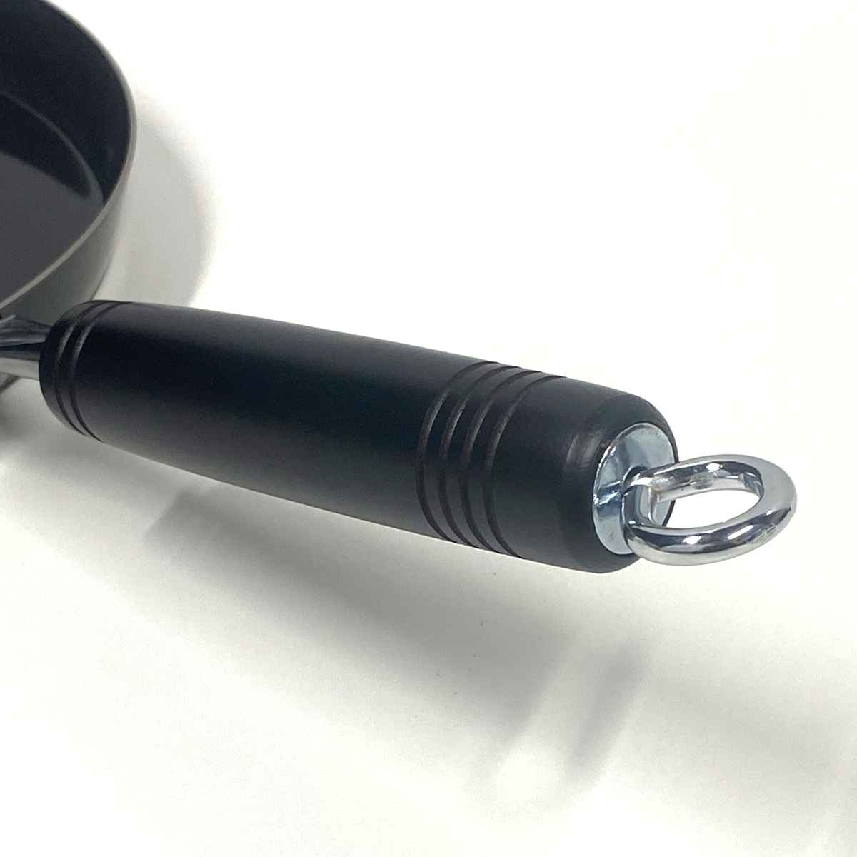 黒い木柄の取っ手なので、焦げ付いても汚れが目立ちにくいです。握りやすい角度に調整されているので調理しやすいです。取っ手にはフックが付いているので、吊り下げ収納に便利です。
