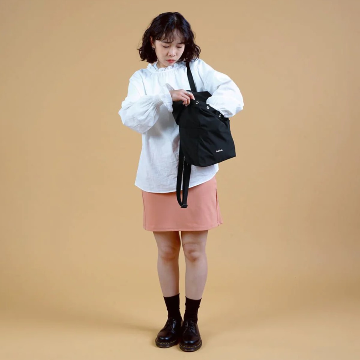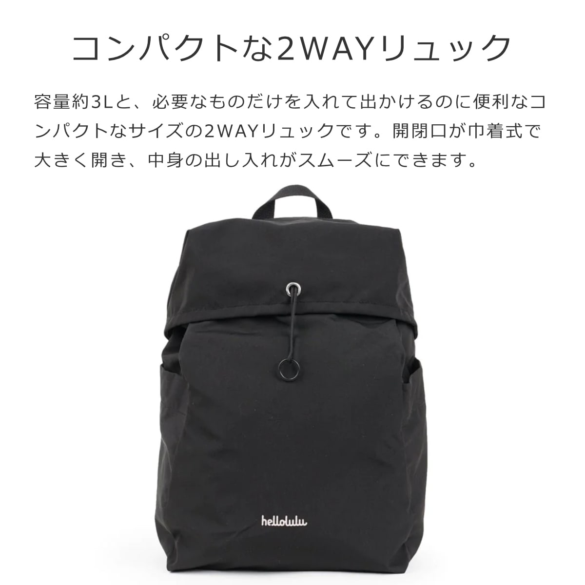 容量約3Lと、必要なものだけを入れて出かけるのに便利なコンパクトなサイズの2WAYリュックです。開閉口が巾着式で大きく開き、中身の出し入れがスムーズにできます。