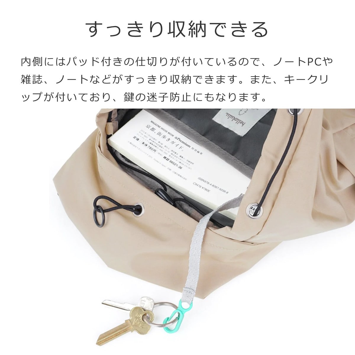 内側にはパッド付きの仕切りが付いているので、ノートPCや雑誌、ノートなどをスッキリ収納できます。キークリップも付いており、鍵を無くしにくいです。