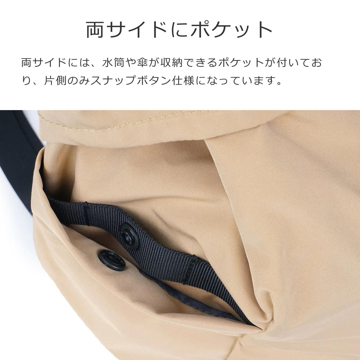 両サイドには、水筒や傘が収納できるポケットが付いており、片側のみスナップボタンの仕様です。