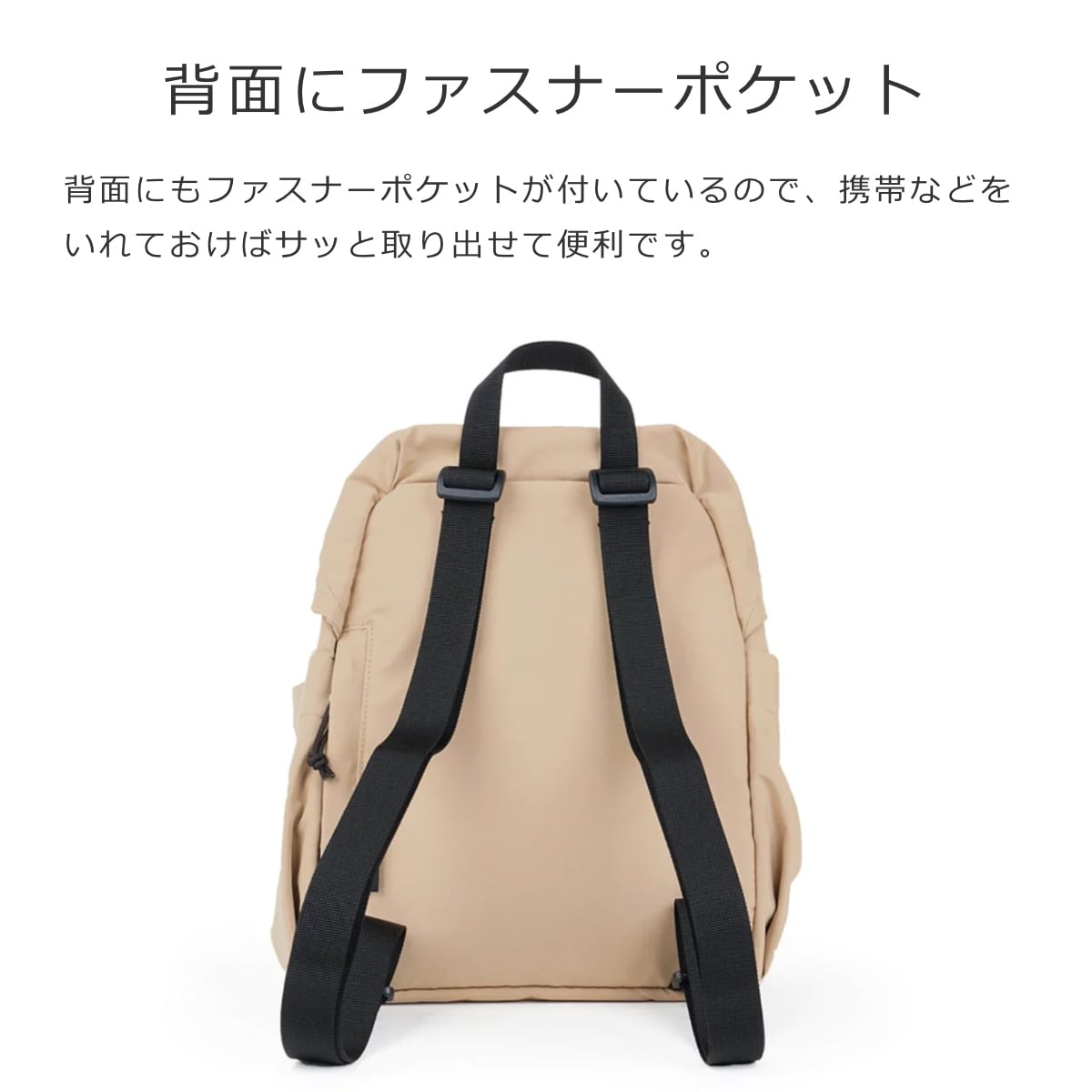 背面にもファスナーポケットが付いているので、携帯などをいれておけばサッと取り出せて便利です。